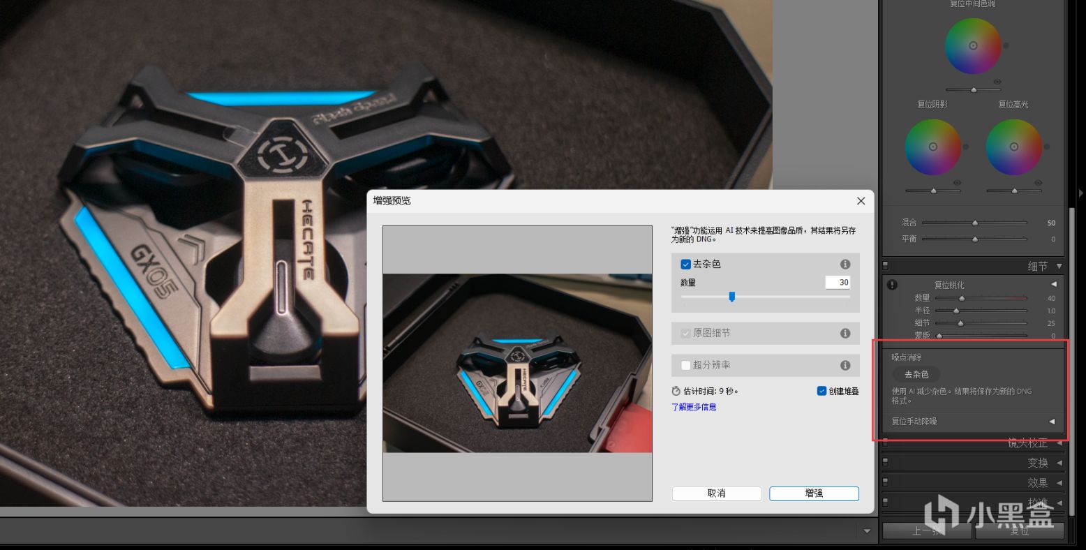 除了建模,还有照片的重新渲染。比如LightRoom新增的“AI去噪点”功能,就动用了显卡的AI计算单元。而且,NVIDIA的RTX显卡就是快一些。应该是做了优化的。最友好的地方在于,我的30系显卡也可以用。
