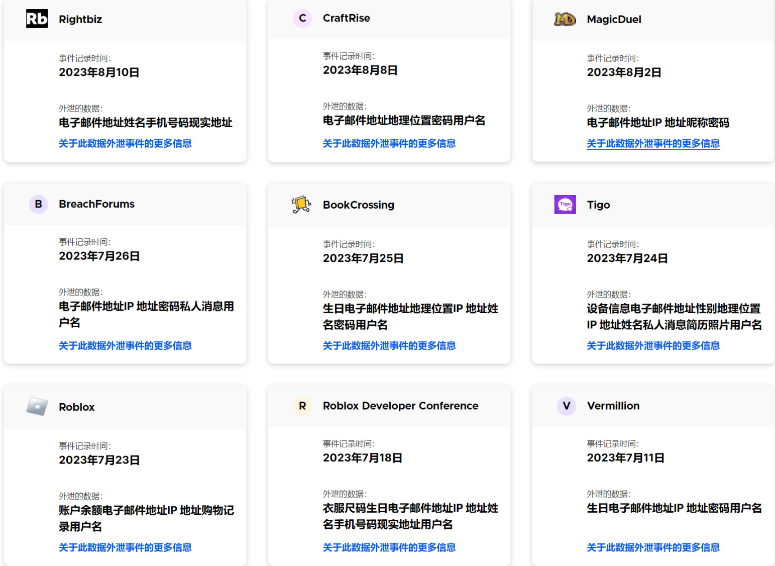 统计数据主要为国外网络平台,并且必须是邮箱才能查询,有一定局限性。如果存在泄露记录,网站会提示相应的次数、时间和事件;反之,则提示“此电子邮件出现在0次已知数据外泄事件中”。网站上还有一个比较详细的外泄事件清单——