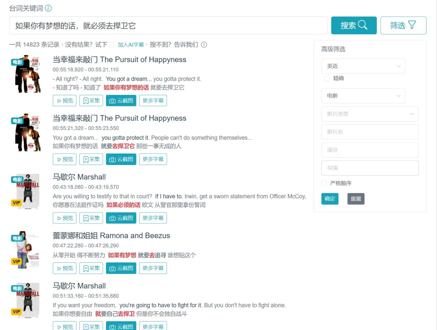 比如搜个“如果你有梦想的话,就要去捍卫它”,右侧进行影片语言、形式、类型等选项的筛选,搜索更加精确。