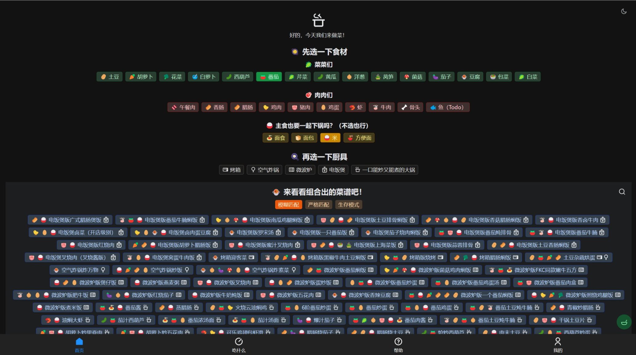 这是云游君开发的一个非常实用的做饭小工具!打开网站就能看到一些常用的食材原材料和厨具,自行选择食材、主食、厨具后,下方就会出现相关的菜谱,点击即可直达B站制作教学视频。