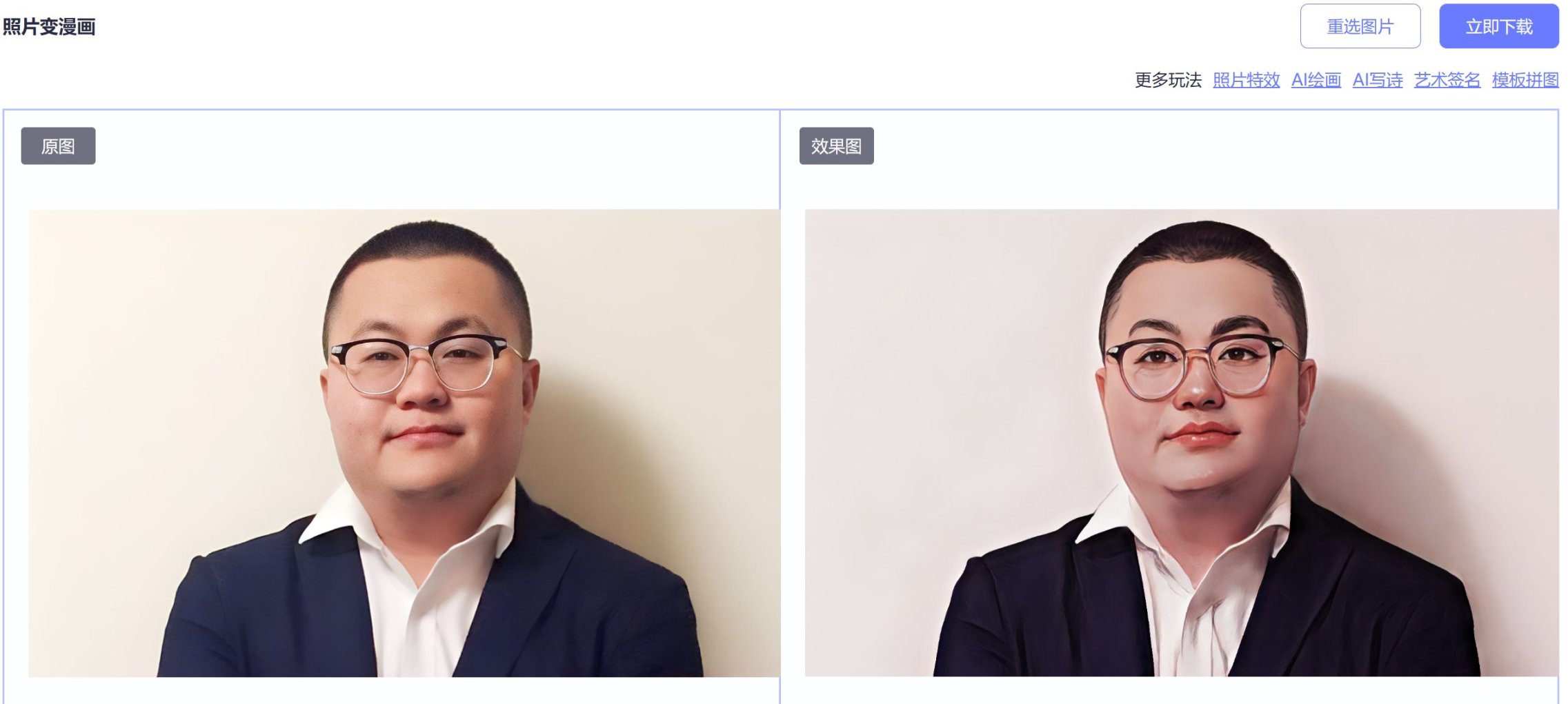 值得一提的是其中的“图片变漫画”功能,上传一张照片,就能在线被转换成漫画样式。效果类似这样,感觉不是很好看,玩玩还行。