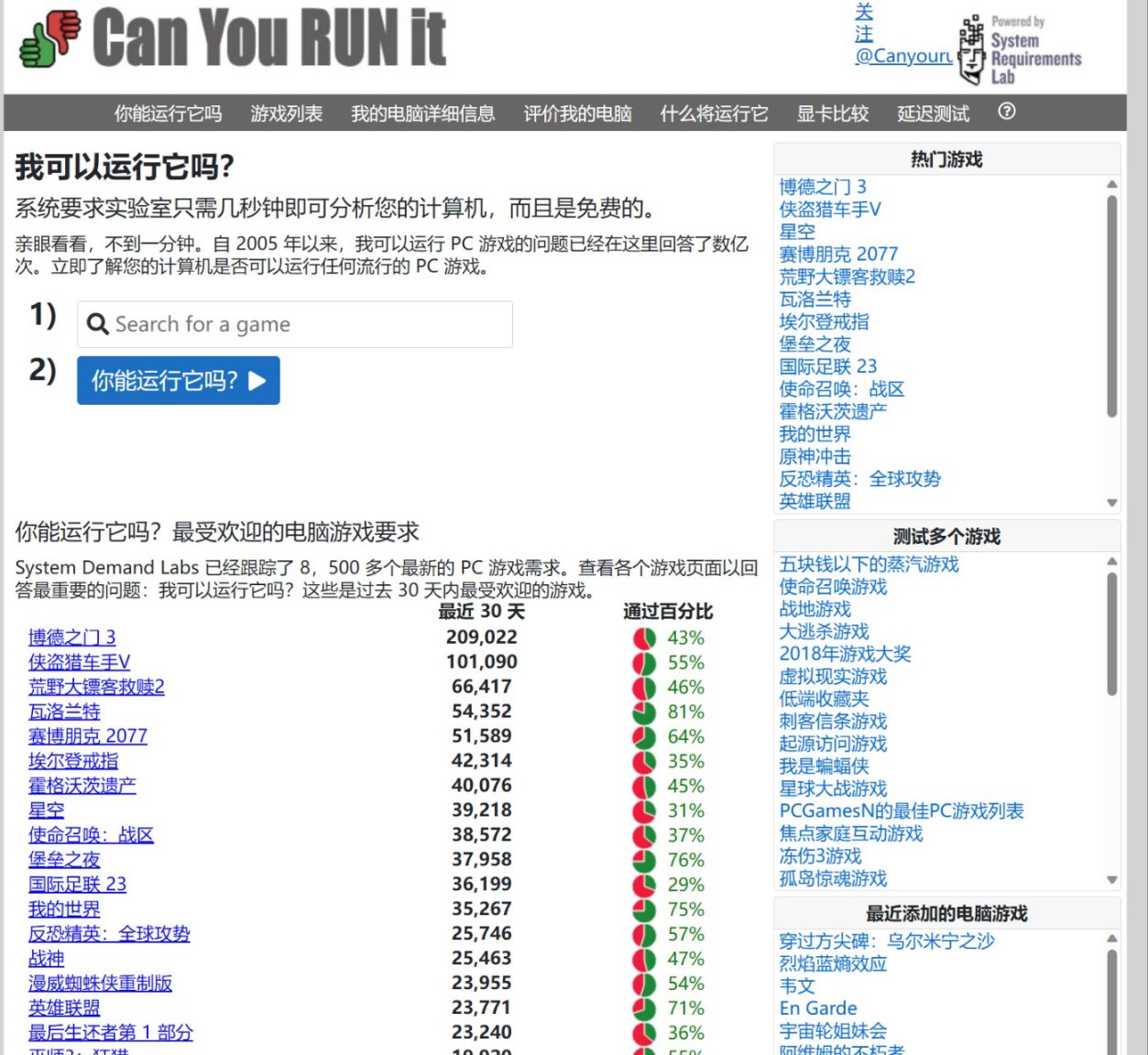 这是一个帮你测试电脑性能,查看能不能运行你想玩的游戏的网站,它的数据库中拥有超过 8500 款游戏,只需要选择你想要玩的游戏,点击“你能运行它吗?”就会自动下载一个测试程序,等待片刻就会告诉你:你的电脑能运行它吗?