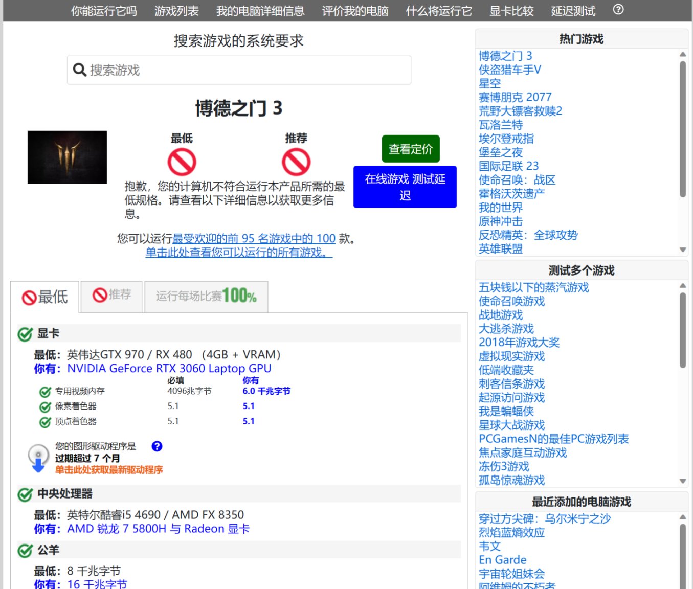 不过我21款的R9000P居然不能玩博德之门3,好歹也是3060,不能玩我是不信的,难道这个网站是个花架子吗?