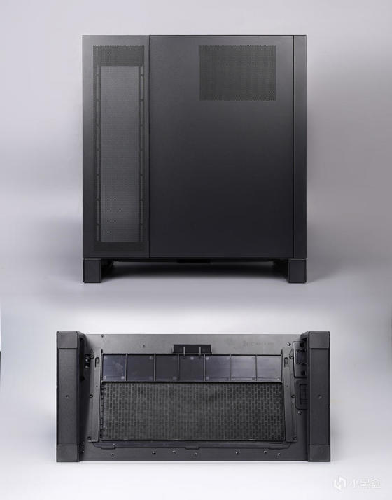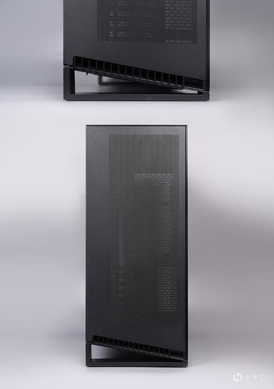 机箱右侧板,左右各有两处 Mesh 通风开孔,对应里头的风扇位,还有电源的进风。机箱底部采用斜向抬高设计,便于气流更顺畅的进入机箱,位置附带抽拉式的防尘网。