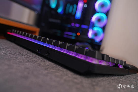 键盘外观,采用上盖铝合金材质打造,表面磨砂处理,搭配黑色 PBT 透光键帽,游侠 2 98 配列上有着不一样的设计,其 F 区与功能按键采用了无间隔设计,腾出空间在右上角添置了一个 ROG 败家眼的功能切换按键和一个多功能滚轮 ,对应设计有指示灯示意,位于字母区与数字区之间。