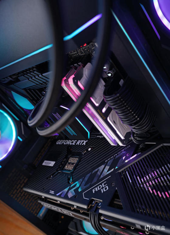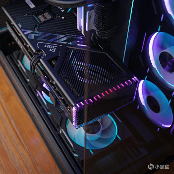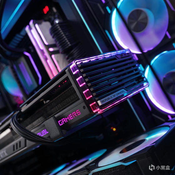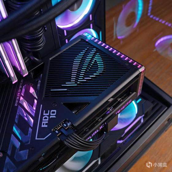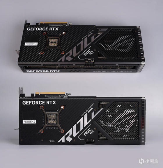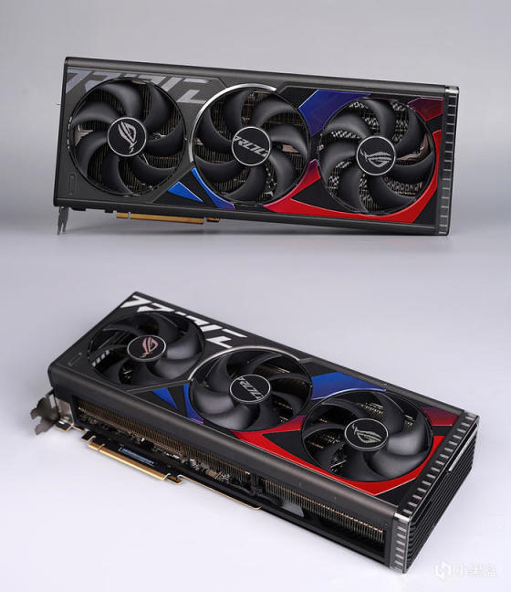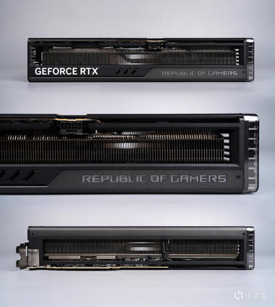 另内置有金属中框设计,增强显卡的扛变形能力,亦辅助内元器件散热,两侧大面积的鳍片外露,增强散热效率,外侧左边 GEFORCE RTX NV 强制图标,右边则为 REPUBLIC OF GAMERS ROG 英文全称,具备 ARGB 发光效果。供电部分,依旧使用的是单 16Pin 供电接口,附带有 1 转 3 × 8PIN 供电线、采用 18+3 超合金数字供电方案,GPU 部分使用了 MP2888A 控制芯片 + TDA21570(70A)MOSFET,显存部分使用 UP9529QQKF + SIC6389(50A)供电方案,当下顶级旗舰非公配置。