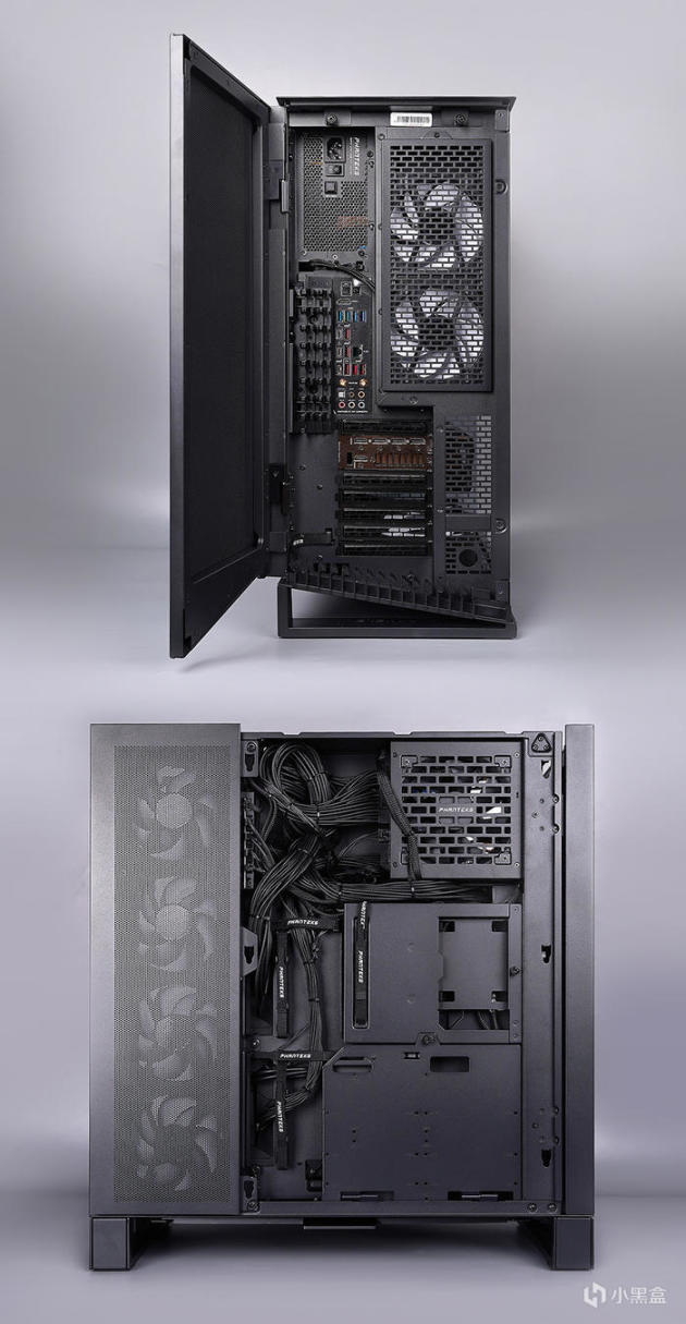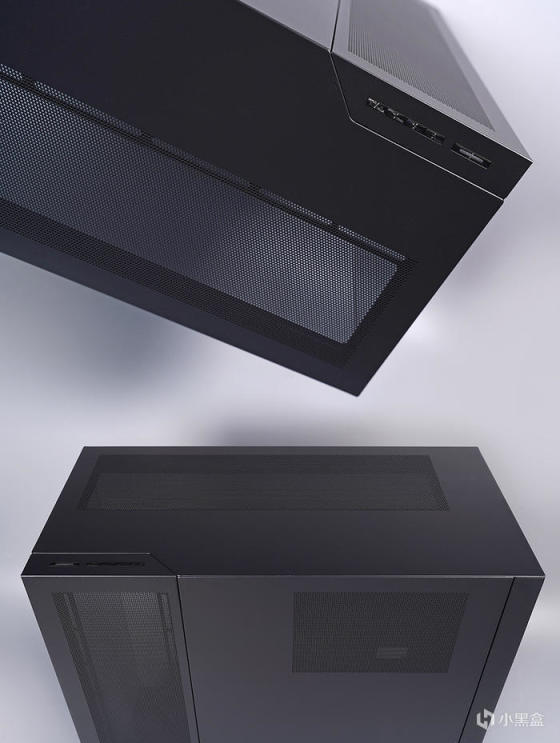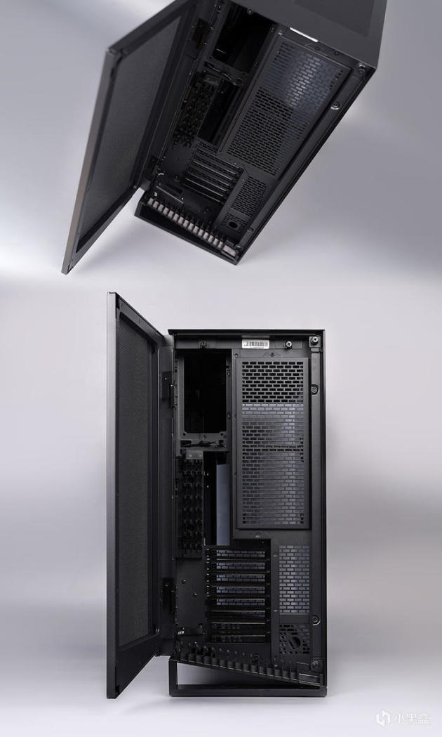 机箱尾部采用翻门式设计,面板可遮挡掉位置上的线材,保持机身的整洁度,对应下方带有走线槽,整个面板采用大面积 Mesh 通风开孔,给到平台充足的排风散热规模。