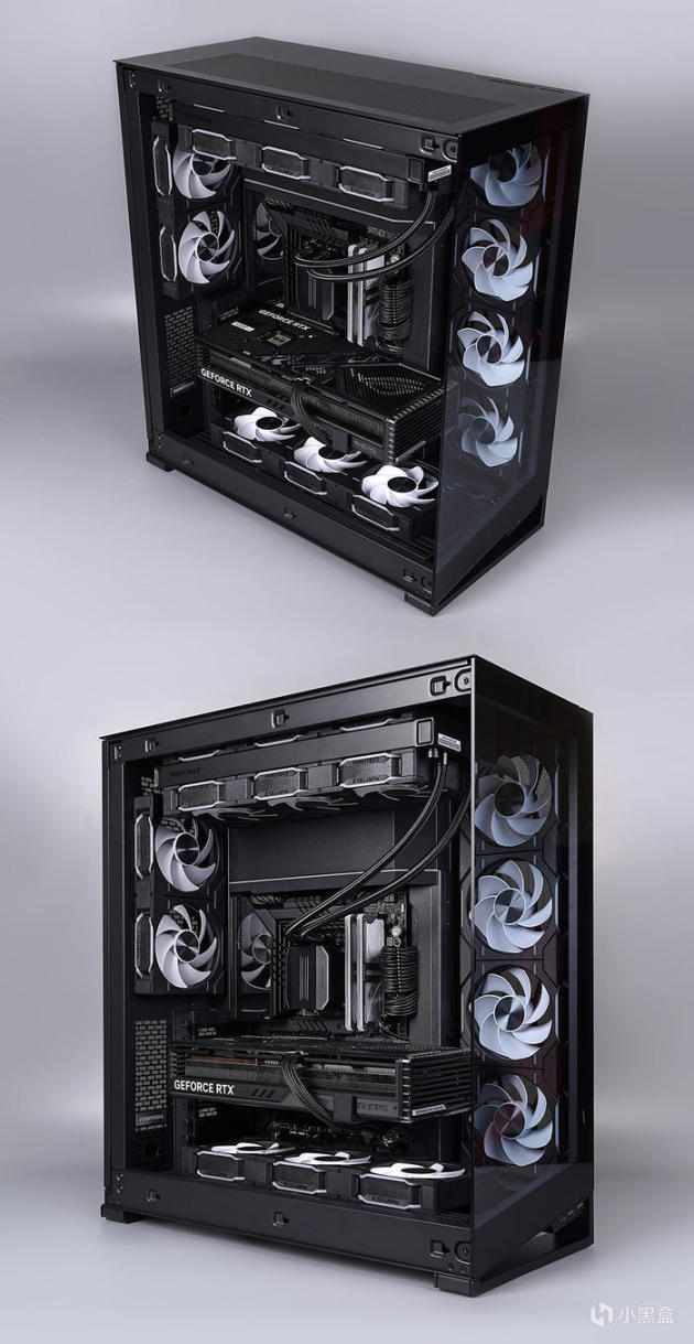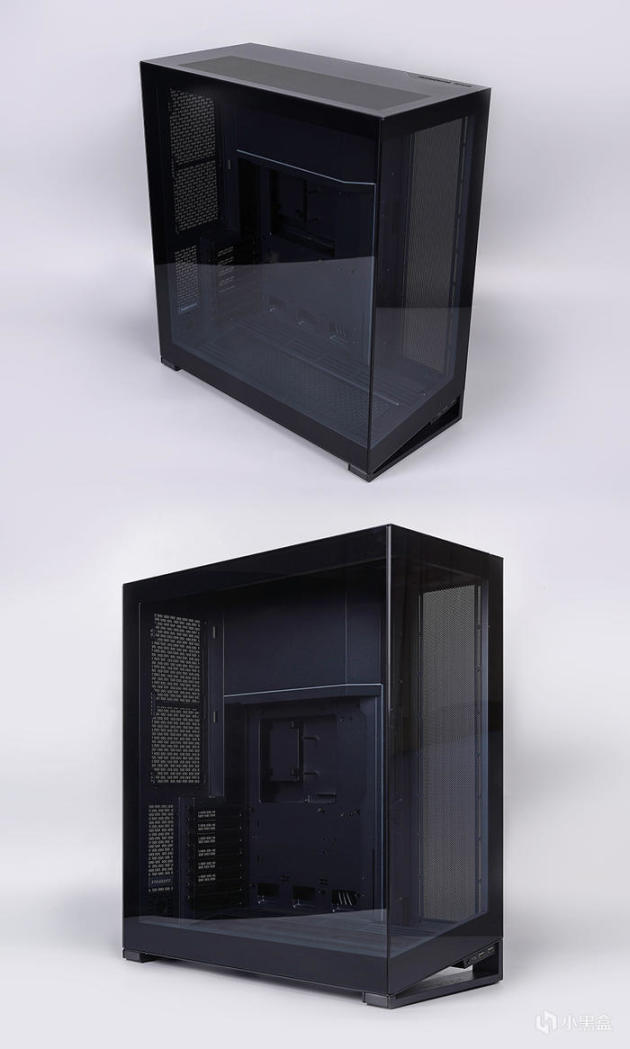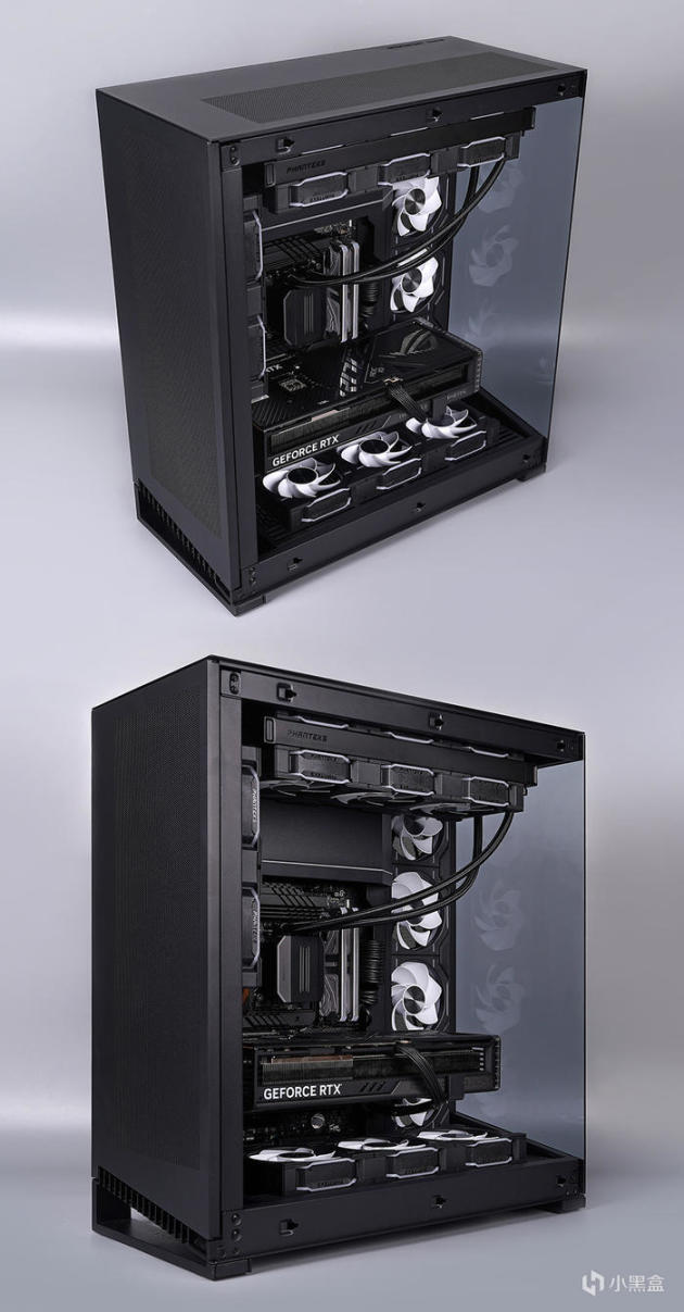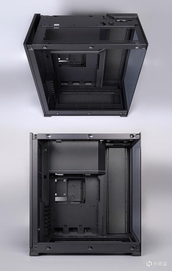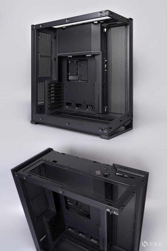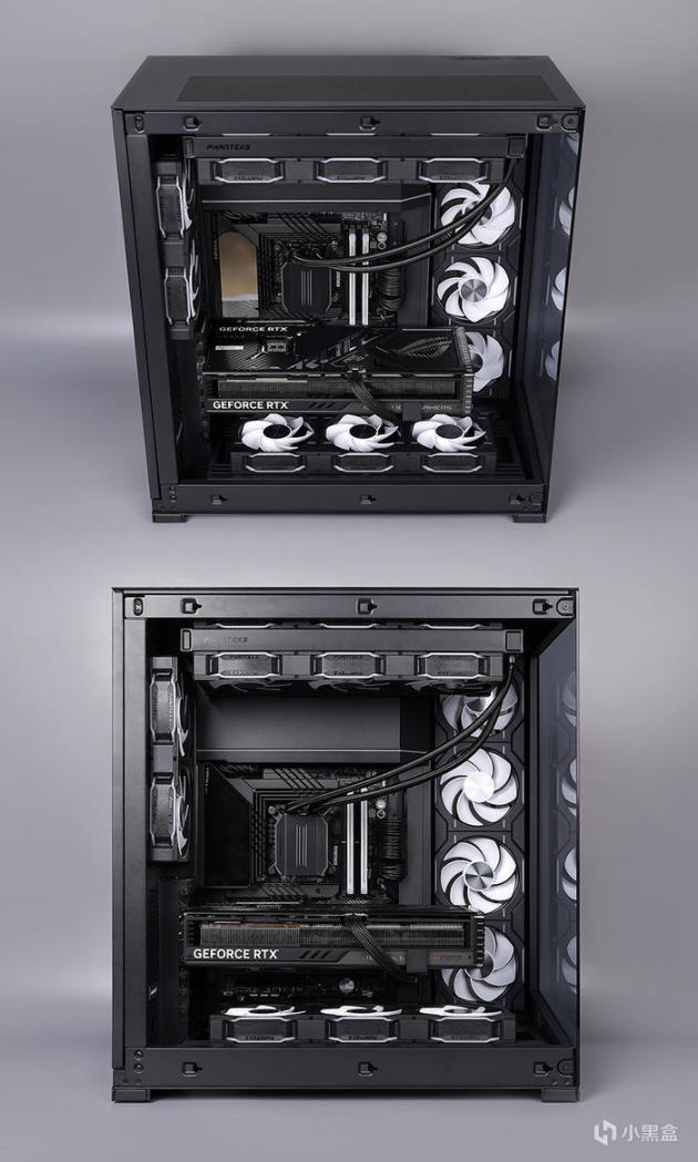 卸下机箱面板,顶部支持安装三个 120 风扇( 120/240/360 冷排),因为顶部的大额头设计,所以顶部位置可轻松实现超厚冷排夹汉堡的安装方式。内部支持安装:Mini-ITX、M-ATX、ATX、E-ATX(限宽 277mm)、SSI-CEB(限宽 290mm,需拆除灯板),显卡最大长度 450mm,塔式风冷最大高度 185mm。