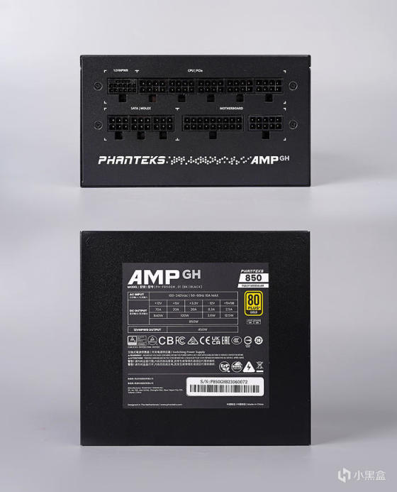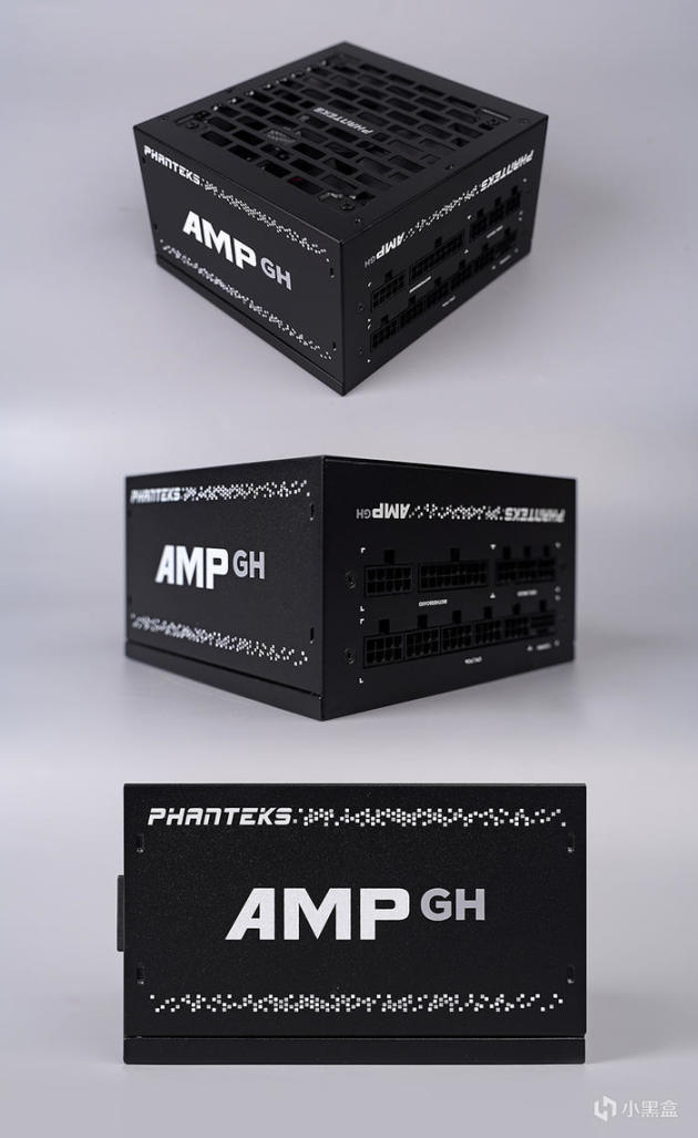 电源本体采用了短机身尺寸设计,具体尺寸140×150×86mm ( L×W×H ) ,短小的身材可以更好的兼容到机箱,两侧型号品牌标识及图案,居中标注型号 AMP GH。