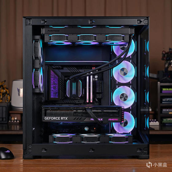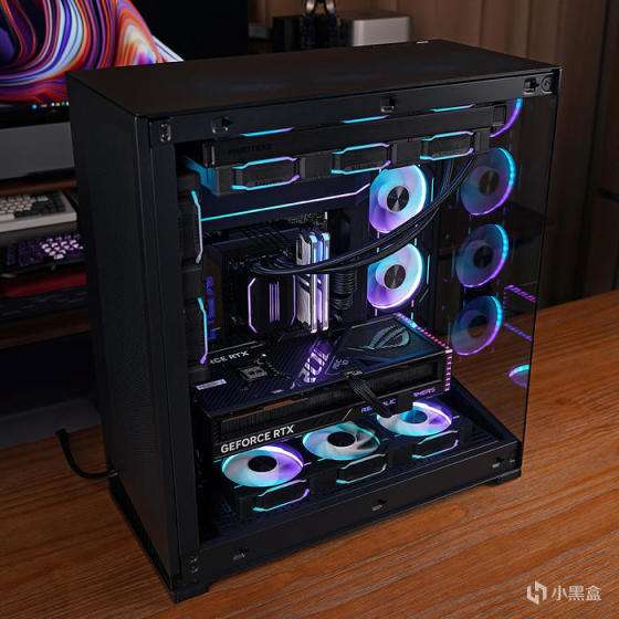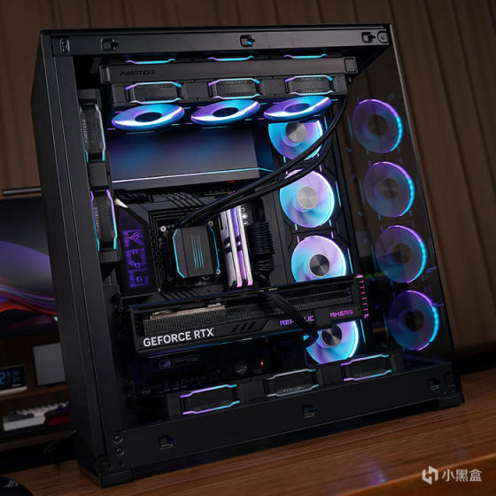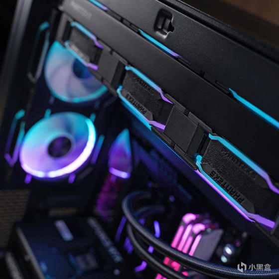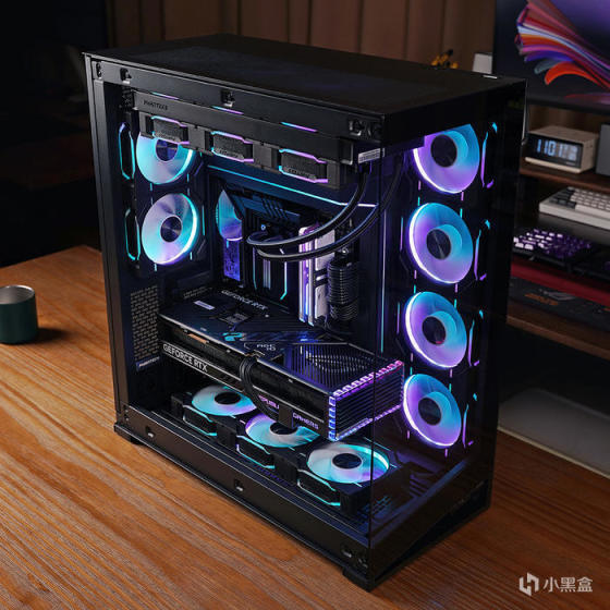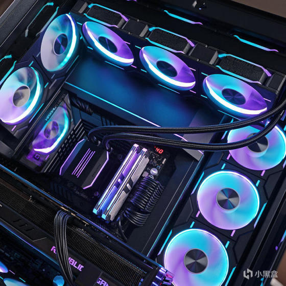 海景房机箱的风扇位,不填满不舒服!冷排夹汉堡,合计共需要 15 把的 120 风扇,统一选用追风者自家 D30-120 ARGB 幻彩积木风扇,采用十分便捷的组装结构设计,外观及灯光样式颇具硬朗机甲风格,另外与自家 T30 一样,D30 对应也是 30mm 的厚度,也有着更强的散热效能。