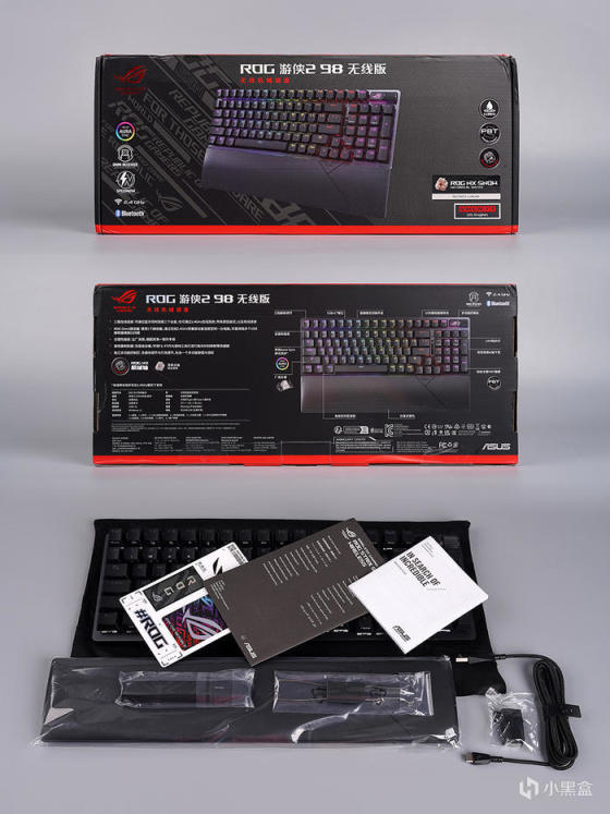 首先看看键盘,华硕最新推出的 ROG 游侠 2 98 无线机械键盘,外包装延续 ROG 系列的设计风格,正面带有键盘本体展示,图标标注键盘卖点,AURA 灯光、Omin 接收器、SPEEDNOVA 无线技术、2.4G 、蓝牙、PBT 二色键帽、ROG 雪武白轴(标注自带润滑),背面键盘具体的中文介绍。里头附件给到有贴纸、说明书、键盘手托、额外的的空格、拔轴拔键器,Type-C 连接线、还有转接头。