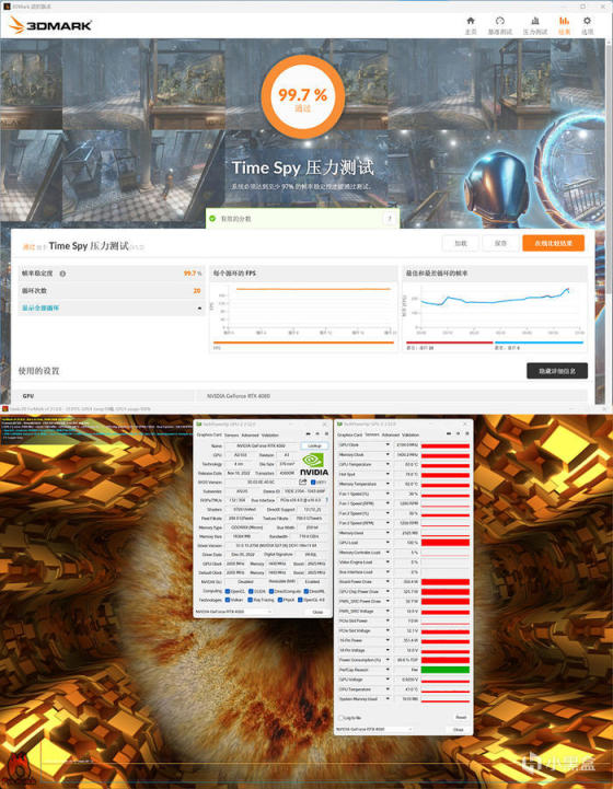 显卡 TIME SPY 压力测试 99.7% 通过,FURMARK 满载测试,过程 20 分钟左右,华硕 TUF GAMING RTX 4080 OC,GPU 频率 2200MHz 上下,显存维持 1400MHz ,核心温度 63.8°C(结温 74.8°C),显示功耗 358.4W 左右。