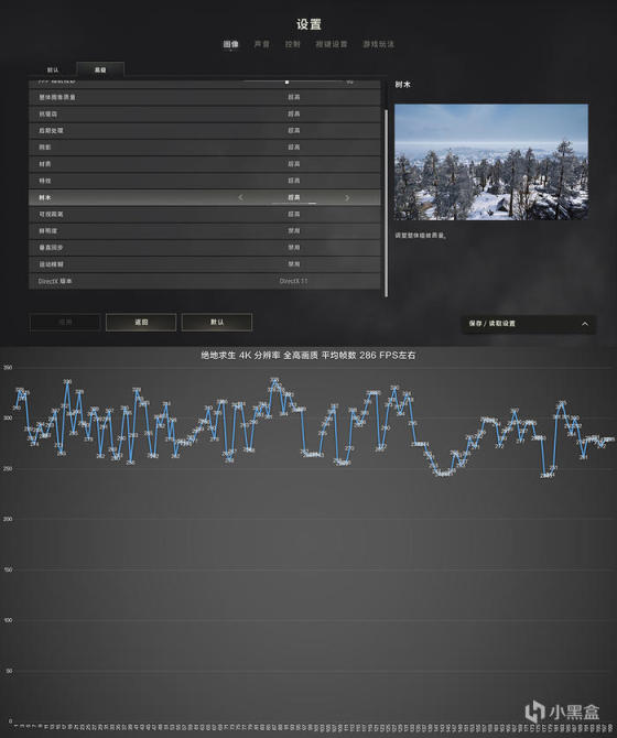 绝地求生,4K 分辨率,极高画质,平均 286FPS 左右。