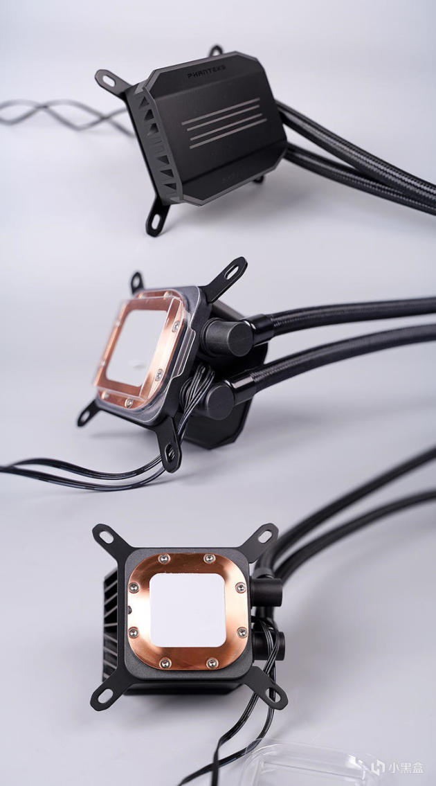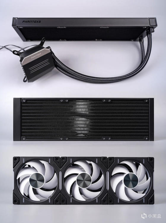 水冷本体采用通体黑色外观设计,编织包网的橡胶水管,官标长度 40cm,通过附带的水管卡扣,有利于水管的塑性,给到更好的视觉效果。冷排两侧 PHANTEKS LOGO 修饰,具备有 14 条的水道,做工不错,鳍片十分的整齐,官标厚度 27cm。搭配三个零售款的 D30-120 ARGB 积木风扇,具体后面再做说明。