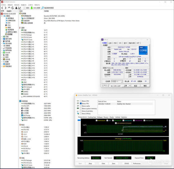 CPU 满载温度表现,AIDA64 单烤 FPU 压力测试,20 分钟左右,P-CORE 温度最大值 82°C,E-CORE 温度最大值 74°C,CPU 显示功耗 220W 左右。
