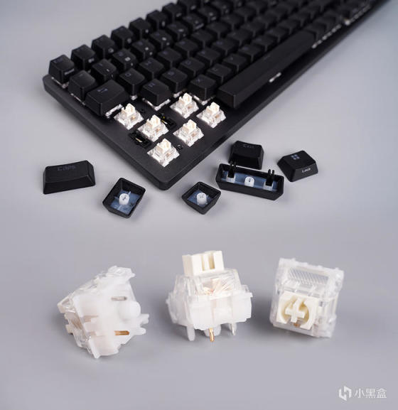 采用 Type-C 接口、有线、无线 2.4G 蓝牙三模设计,通过开关切换使用模式,另设计有接收器收纳仓。采用悬浮裸轴设计,支持热插拔,内置有硅胶夹心及轴下垫配置,搭载自家 NX 雪武白轴,有着还不错的打字手感及声音表现。