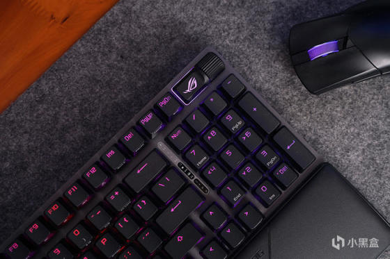 华硕 ROG 游侠 2 98 无线机械键盘,采用 98 配列设计,有着明显小于 104 配列键盘的尺寸,非常接近于 80 配列键盘的尺寸,却有着其所不具备有的数字键盘,兼具了小巧尺寸又不失务实的选择。外观采用上盖铝合金材质打造,表面磨砂处理,搭配黑色 PBT 透光键帽,游侠 2 98 配列上有着不一样的设计,其 F 区与功能按键采用了无间隔设计,腾出空间在右上角添置了一个 ROG 败家眼的功能切换按键和一个多功能滚轮 ,对应设计有指示灯示意,位于字母区与数字区之间。附带一个皮质键盘手托,采用磁吸的固定方式,触感不错,另带有 ROG 字样修饰。