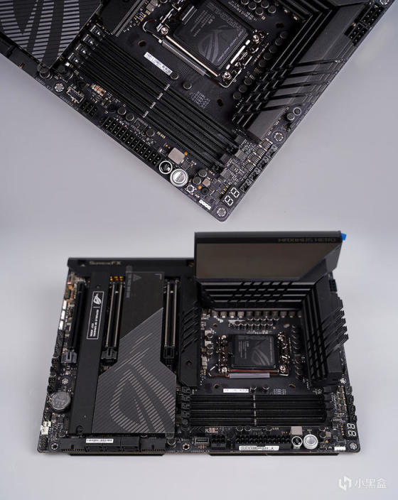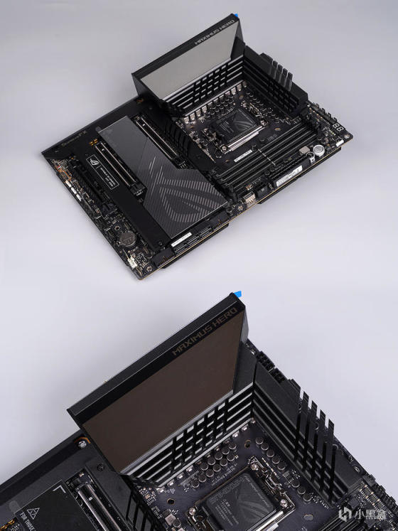 对应双 8PIN 的 CPU 供电接口,可为 13 代 CPU 超频提供充足的电流输出保障,一体式 I/O 马甲,顶部镜面灯光面板,Polymo 动态灯效设计,可呈现两种不同的画面,支持 AURA SYNC 控制灯效,边上 MAXIMUS HERO 标注。