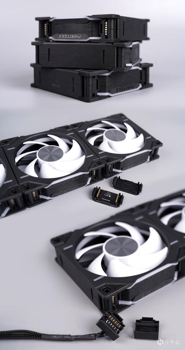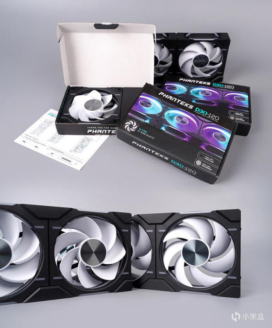 追风者 PHANTEKS D30-120,主打免线拼装的积木风扇,三联包和单包发售,产品包装很精致,正面带有风扇拼装效果展示,黑白两色可选,另还有反向扇叶可选,包装标注附件清单和规格参数。