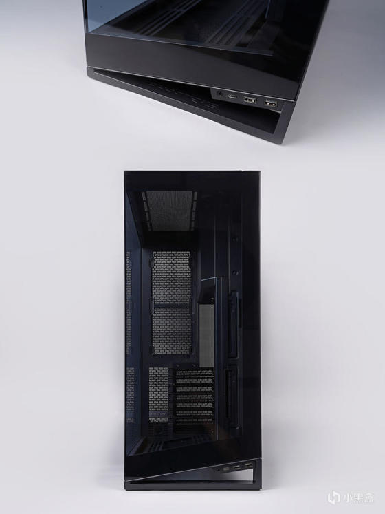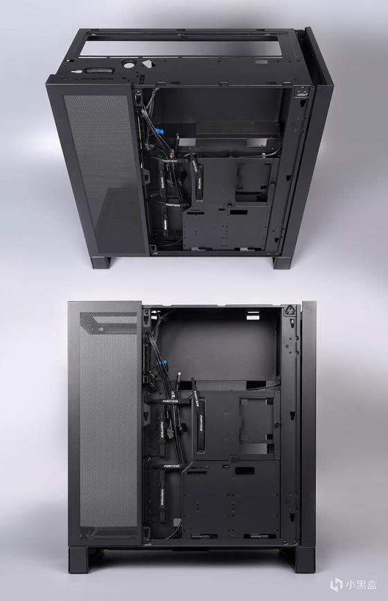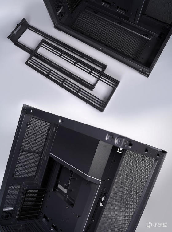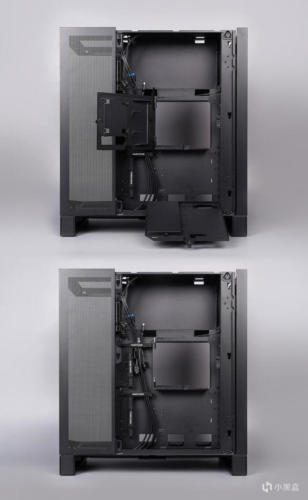 前置玻璃支持拆卸,以获得更为开放的装机空间,内侧风扇支架,支持安装四个 120 风扇( 120/240/360 冷排),另值得一提的是考虑到分体式水冷玩家,对应顶部位置还带有注水口设计(内侧挂水箱正好可以用到)。