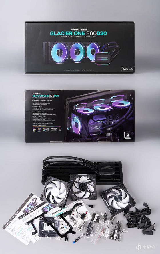 追风者 PHANTEKS 冰灵 D30 360 一体式水冷散热器,包装正面产品渲染图示意,上方标注品牌其型号,右下角标注风扇型号 D30-120,背面装机效果图,左侧标注其卖点,标注各大主板厂商的灯光支持,标注 8 年的质保时间。该款水冷最大的卖点也就是搭配了自家零售款的 D30-120 ARGB 积木风扇,平台支持安装牙膏全家及 AM4/5,附带水管整理卡扣和散热硅脂,风扇螺丝(标准长螺丝以及支持圣环安装的长螺丝各 1 套)。