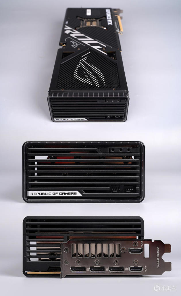 比较吸引眼球当属前面的镂空出风口,采用斜线栅格样式,辅以高光处理的败家之眼点缀,值得一提是这 LOGO 还是错落凸起的,感觉应该是 cnc C 出来的吧,非常的养眼。显卡的前段带有格栅式的装饰罩,遮挡里头露出的热管,另外套了圈 ARGB 灯带装饰,罩子上 ROG 全称铭牌点缀,边上两外接 4PIN PWM 风扇接口,另给到有三个标准支架固定的螺丝孔。尾部接口部分,整卡厚度约占 3.5 个 PCI 卡槽,不过对应挡板依旧采用的是双 PCI 卡槽规格,材质为华硕显卡喜闻乐见的 304 不锈钢( 抗衰老 ),输出接口方面,提供了三个 DP1.4a 和两个 HDMI 2.1 接口 ,相比公版多增加了一个 HDMI 2.1 接口。