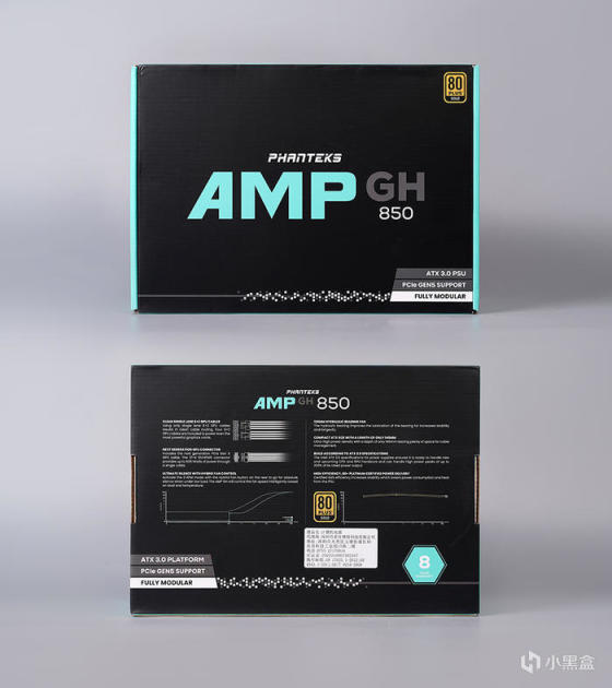 追风者 PHANTEKS AMP GH 850W 全模组 ATX3.0 电源。包装简约风格设计,正面居中品牌及型号,右上角 80PLUS 金牌认证标志,右下角标注 ATX3.0、PCIE 5.0、FULLY MODULAR 全模组。包装背面电源具体的介绍,标注 8 年的质保时间。