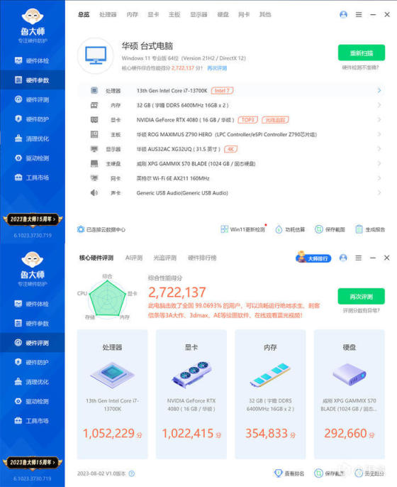 最后测试部分,室内温度 27 度左右,平台仅内存开启 XMP,CPU 降压模式 -1,其余均为默认,WIN11 的系统,实际测试结果或多或少会有些许出入,仅供参考!首先看看鲁大师,具体的配置信息,给到的综合性能得分为 2722137。