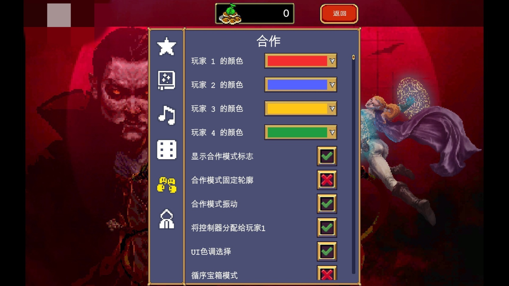 1、点击选项,可以打开里面的合作选项,更改4个人物代表的颜色,或者进行其他合作设置。