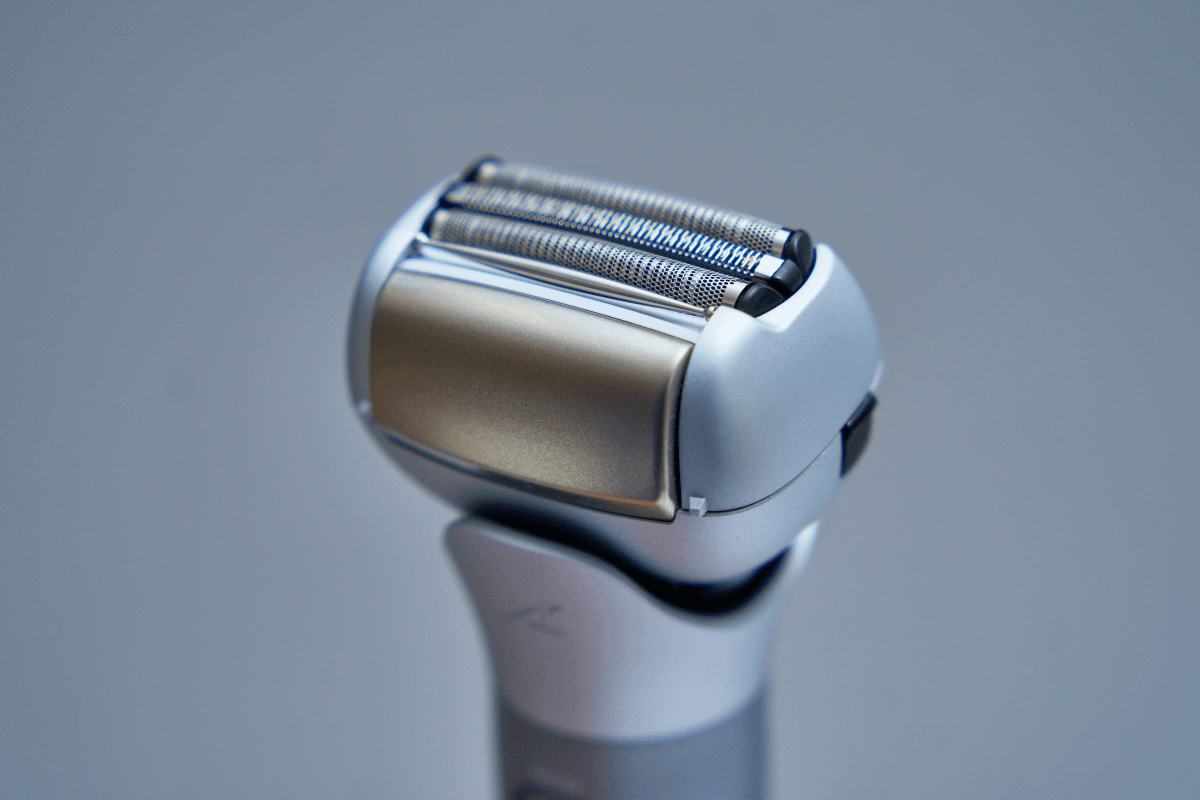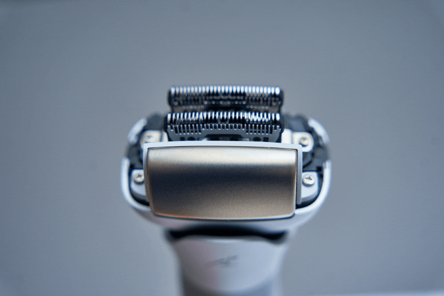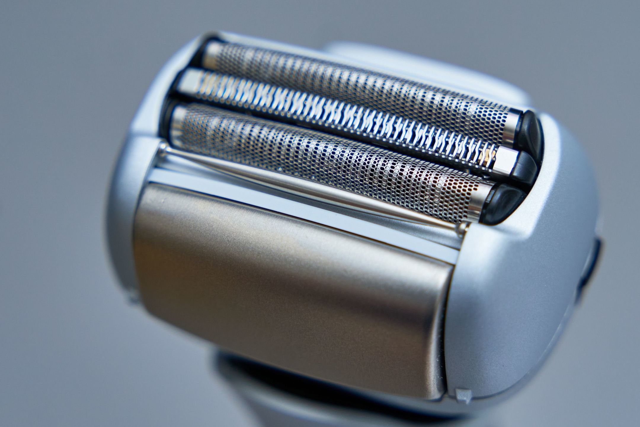 往复式刀头都是条形刀网,刀网超级薄,镂空网孔超级密。透过刀网几乎能够看清紧贴在刀网之下的两套刀片。还有一套刀片是中间刀网本身,你能看出来吗?刀网与暗金色金属块之间的过渡地带专门设置了一个纺锤状的横杆,横杆能灵活转动,增加了剃须过程中的顺滑感,非常细节。
