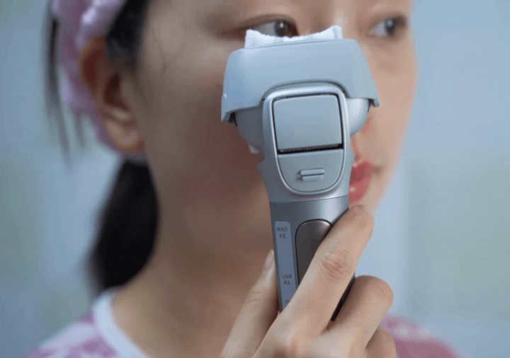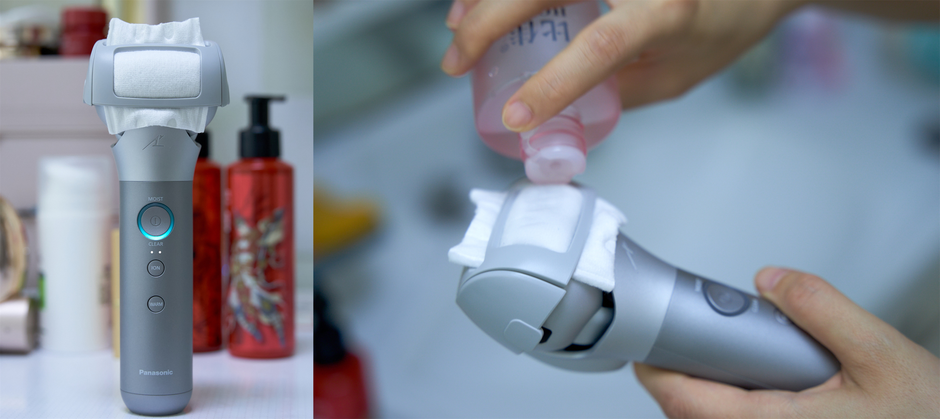 松下MT22的“头盔”其实暗藏玄机,头盔上的开孔可以方便地插入固定一片化妆棉。化妆棉安装之后与钛金面板贴合紧密,再将化妆水滴入化妆棉,就可以使用啦。