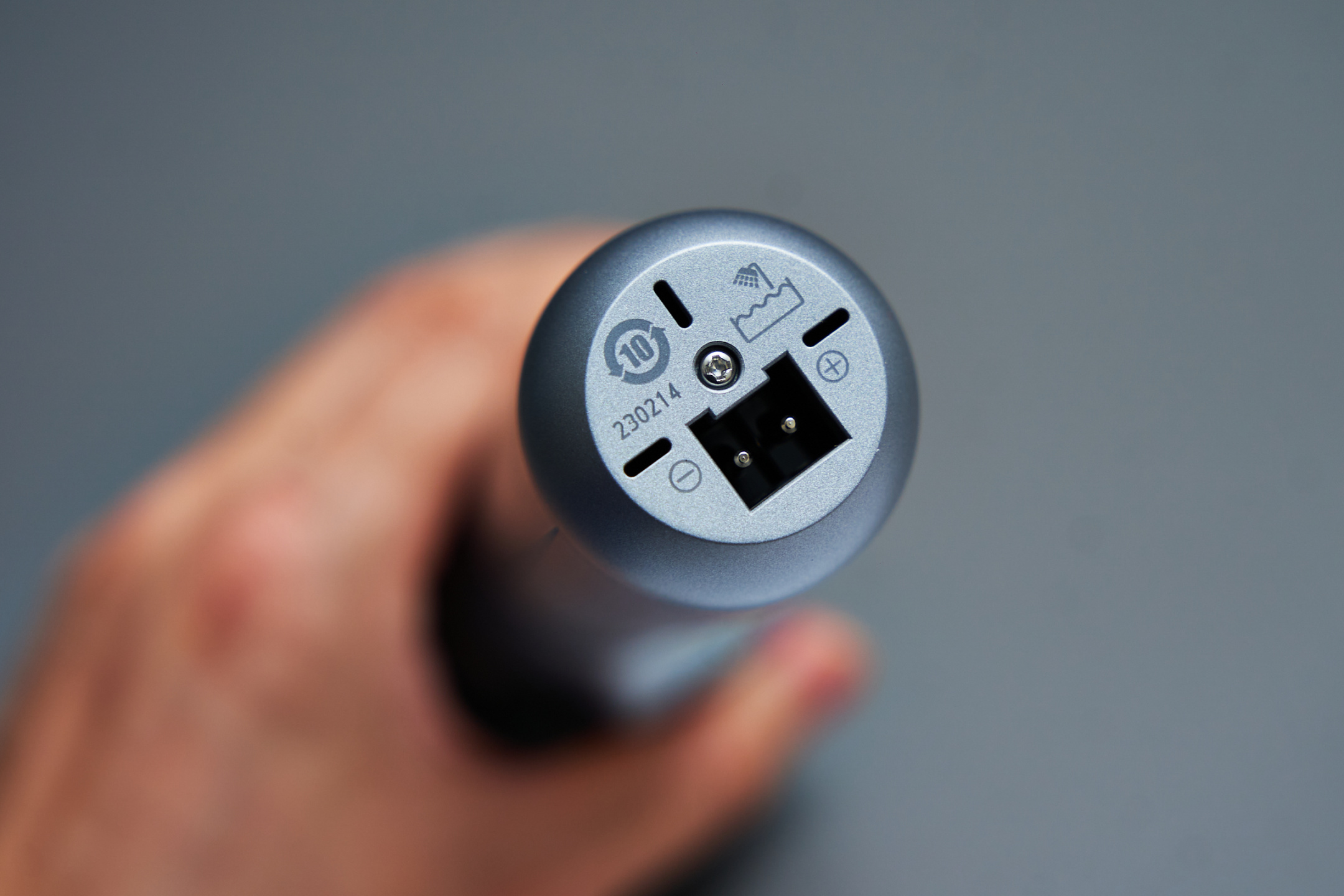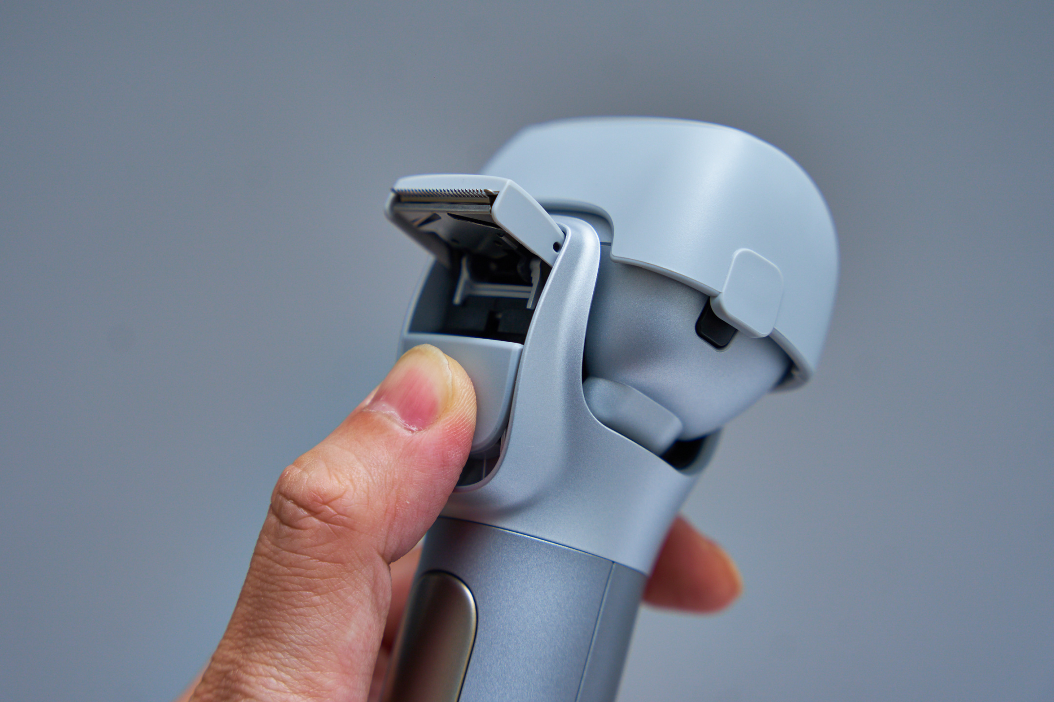 松下MT22的外形像个小锤子,完全符合我对于一个剃须刀的认知。配色方面倒是十分清爽,两种层次的水泥灰色,搭上两处暗金色点缀,优雅中带点严肃的绅士味儿。