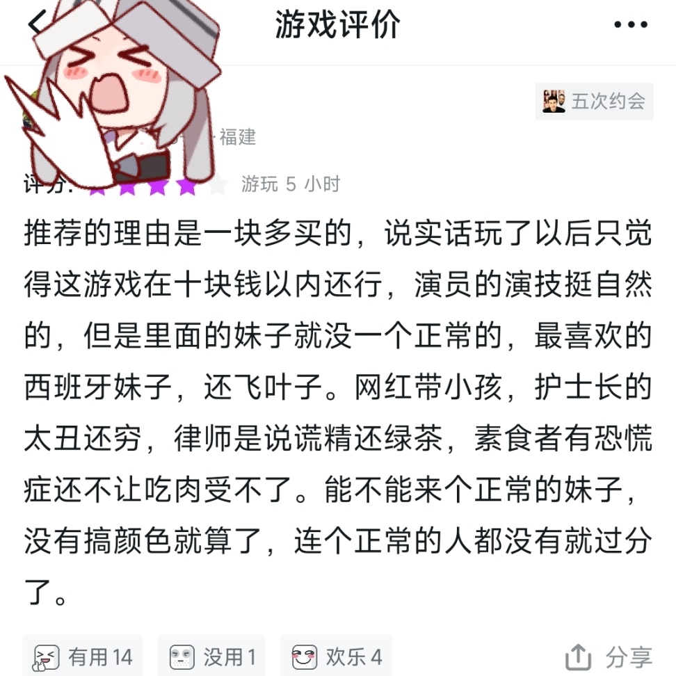 拿这个出来,主要是这个便宜,进过月包,还有一点它是我唯一能看进剧情的视频,毕竟,这就是个视频剧情游戏。