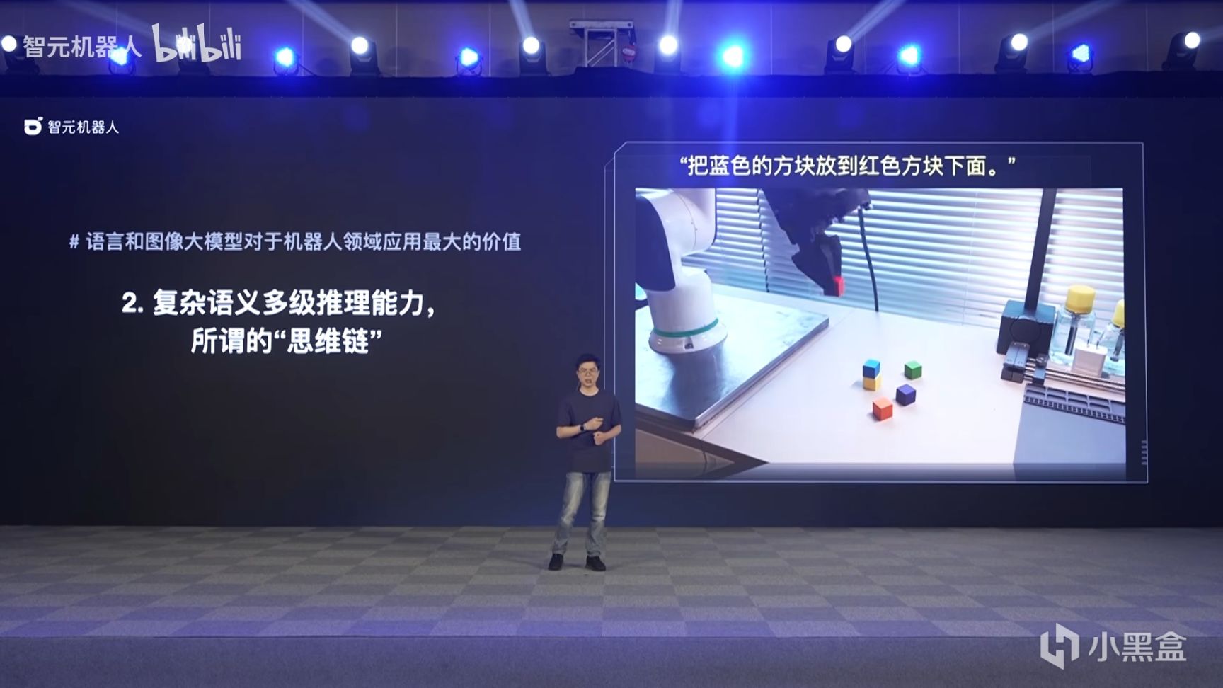 其次是複雜語義多級推理能力,大型語言和圖像模型具備複雜的語義理解和多級推理能力,也被稱爲「思維鏈」。例如,在一個視頻中,如果需要機器人將藍色方塊放在紅色方塊下方,這涉及到理解重力的概念和多級操作的過程。機器人需要通過推理來理解物體不會懸浮在空中,以及如何通過多個步驟來完成任務。這種多級推理的能力使得機器人能夠應對更復雜的任務和場景。