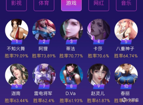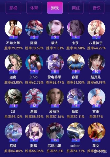 游戏组,英雄联盟的阿狸、卡莎、好运姐和琴女入选,FF7中的蒂法和爱丽丝、尼尔中的2B、OW的DVA入选,原神的雷电将军、八重神子、甘雨、刻晴入选,Fate中的saber、仙剑里的赵灵儿入选。