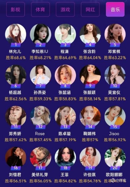 音乐赛道,韩国歌手林允儿、IU、郑秀妍、Rose、Jisoo入选百强,程潇、张含韵、邓紫棋、杨超越、张韶涵、张靓颖、吴宣仪、陈卓璇、鞠婧祎、刘惜君、王菲、许佳琪、欧阳娜娜入选,“冷门歌手”新加坡歌后孙燕姿同样入选百强。