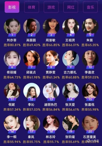又到了一年一度的女神大赛,在有历届女神刘亦菲、高圆圆等参与的前提之下,今年众多黑马杀出!截至8月18日,女神大赛100进32阶段,刘亦菲断层优势拿下第一,战鹰成为超级黑马位列第二,高圆圆第三,田径女神夏思凝第四,IU逆势冲上第六,网红杀猪饲料第十!