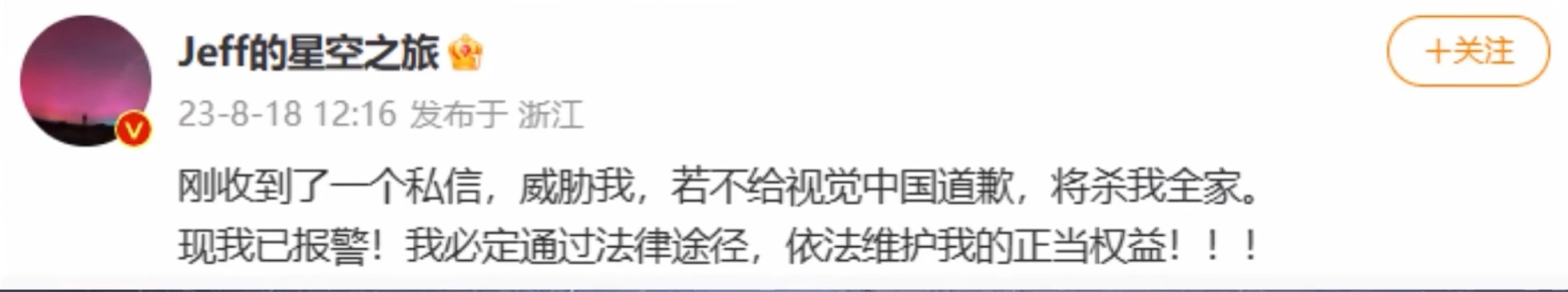 这次直接是收到了死亡威胁,若不道歉就杀光全家