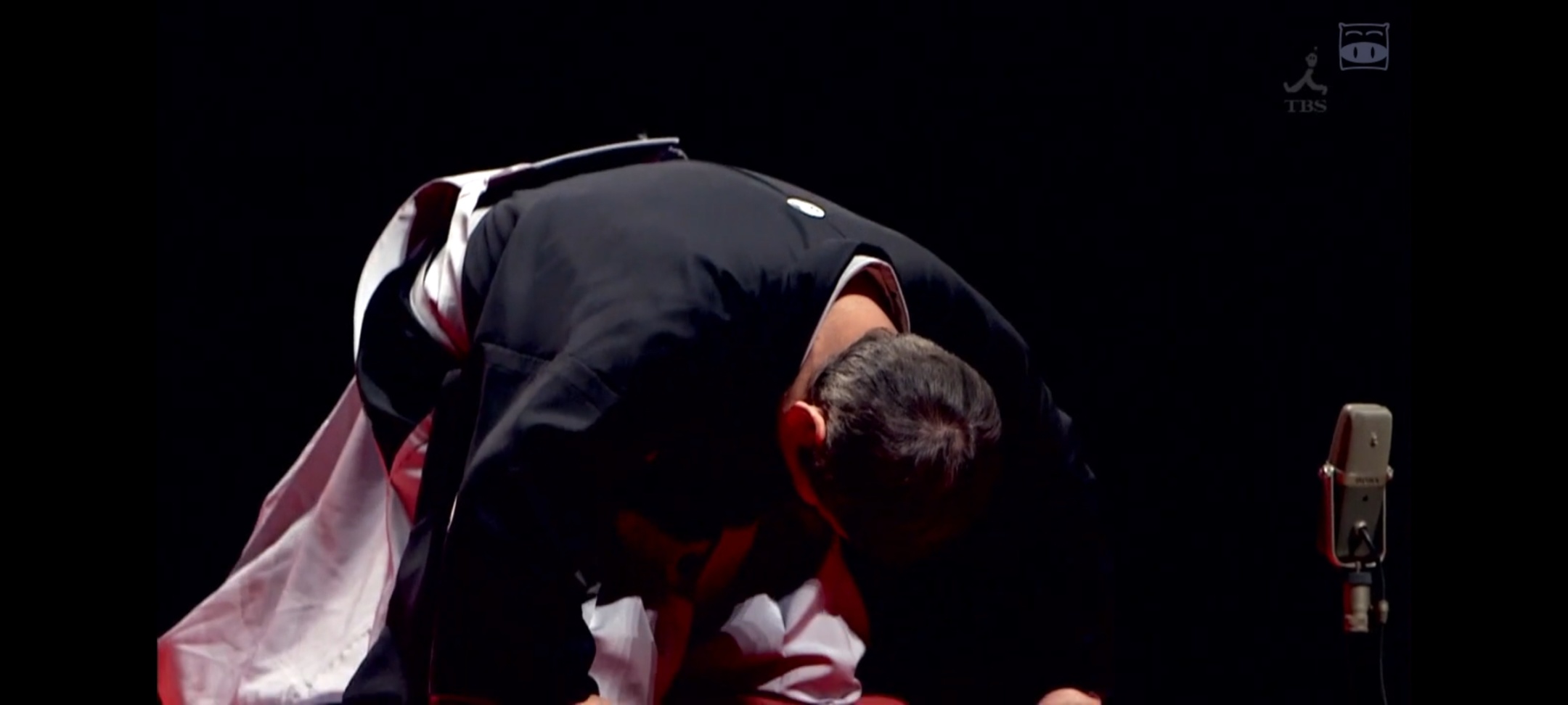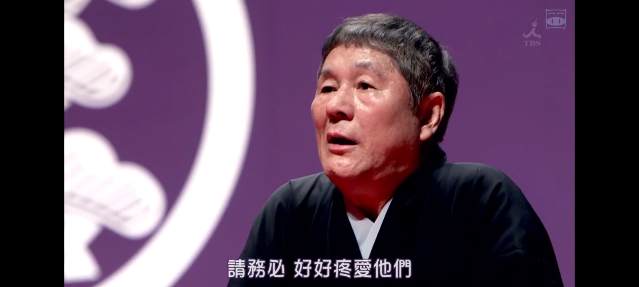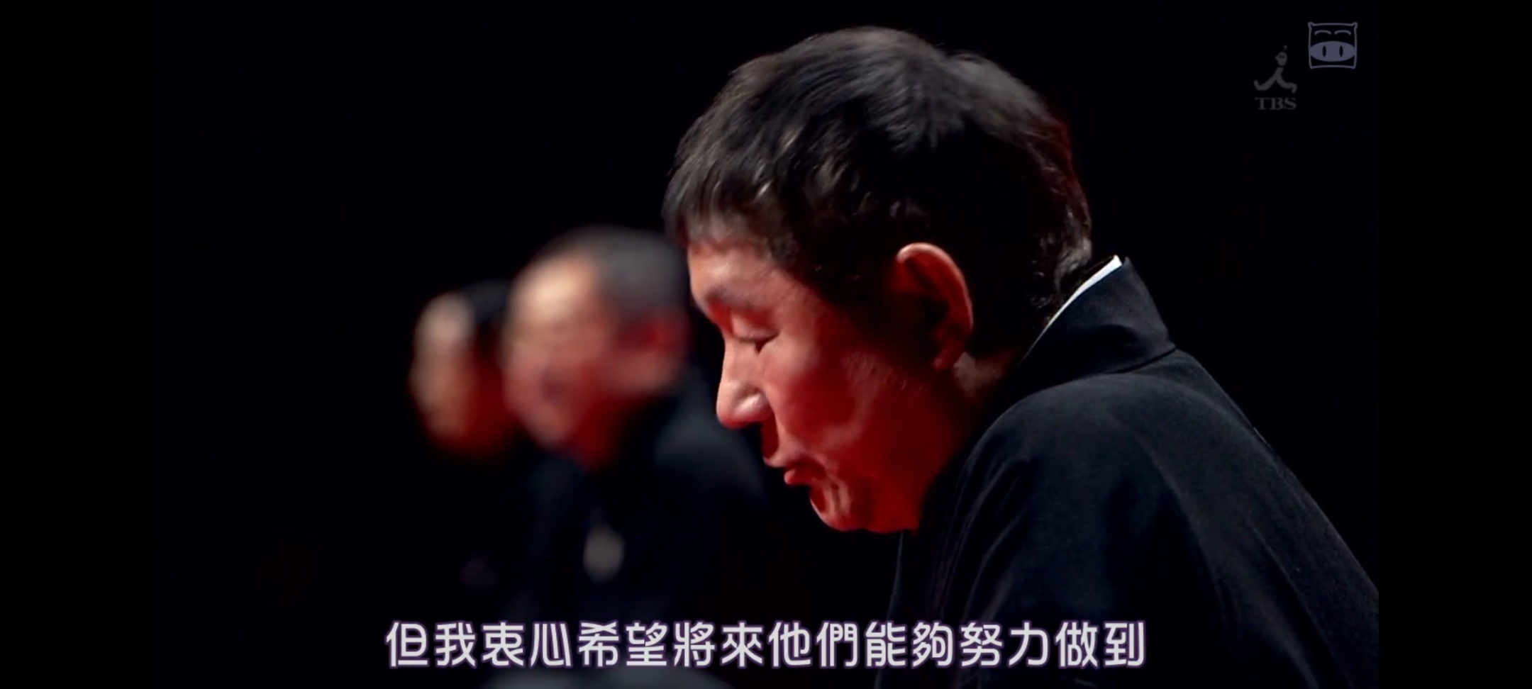 四人跪坐于台,聆听着前辈的教导,轮到师傅时,师傅向观众们深深鞠躬,他希望观众们可以好好的疼爱他的弟子,往日那个粗糙暴躁不向任何人屈服的老人此时向观众们低下头,为了他的弟子而低头。