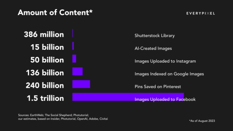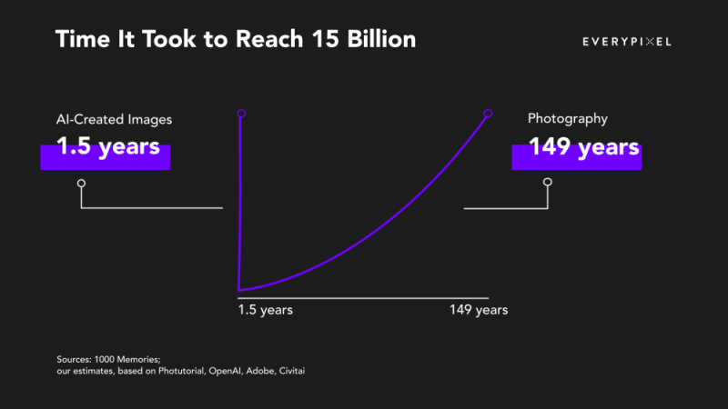 近日,在Everypixel Journal 公布的最新关于人工智能的统计报告显示,在过去的18个月里,人们使用AI已经生成150亿张图片,粗略换算相当于所有人类摄影师150年的拍摄量。
