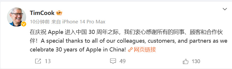 蘋果公司 CEO 蒂姆・庫克今日早間發文,慶祝蘋果進入中國 30 週年,並表示“衷心感謝所有的同事、顧客和合作夥伴”。