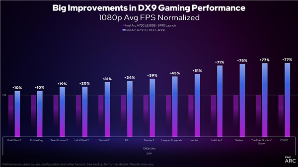 截止今年第一季度,通过8个大版本驱动的更新,Intel Arc显卡实现了发布以后多达43%的DX9游戏性能平均提升,《CS: GO》、《上古卷轴5:天际》、《群星》、《半条命2》等部分游戏甚至超过70%,同时帧延迟比首发驱动改进了60%。