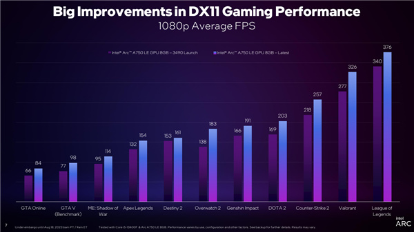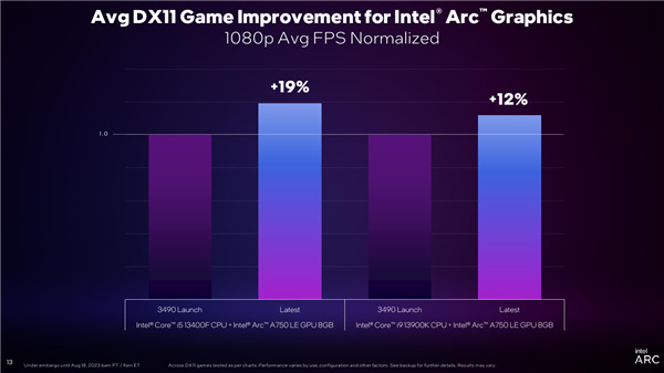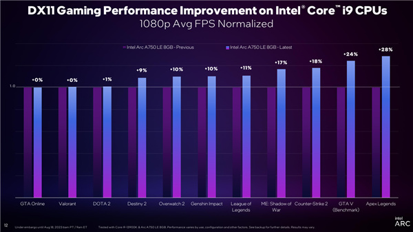 比如说Arc A750搭配i9-13900K(虽然一般不会有人这么做),DX11游戏性能也比首发时平均提升了12%。