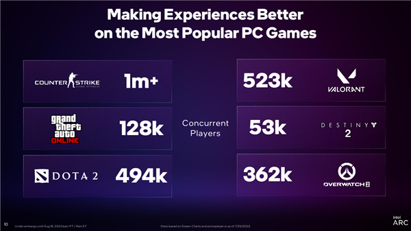 自发布以来,Intel已经先后为Arc显卡更新了多达30个版本的驱动,这正是性能持续提升、兼容性持续优化的关键所在,同时也让多达57款游戏在发布当天就得到了Intel新驱动的支持。