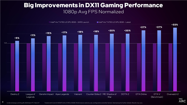 根据Intel最新提供的数据,Arc A750 8GB限量版显卡在搭配i5-13400F处理器、最新驱动,对比首发驱动,1080p分辨率下的DX11游戏性能已经提升了19%,基于99%帧占比指标的流畅度则提升了20%!