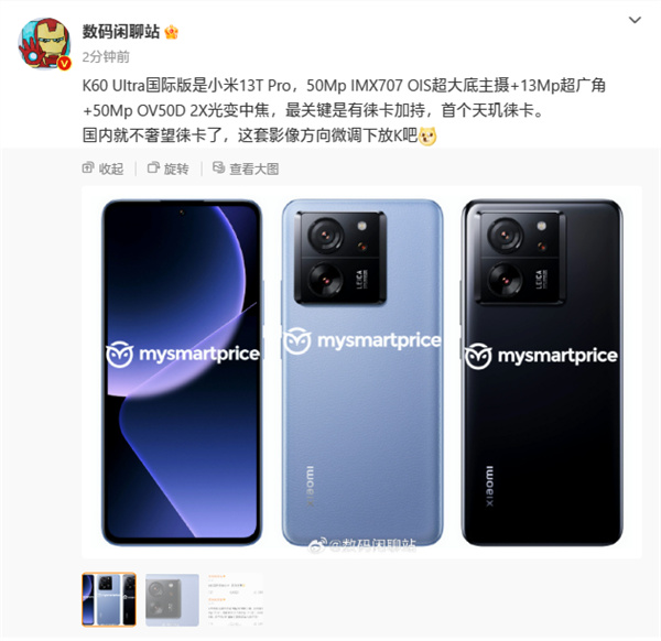 值得注意的是,该机还将在海外多地上市,更名为小米13T Pro,配置有一些变化,尤其是影像方面。