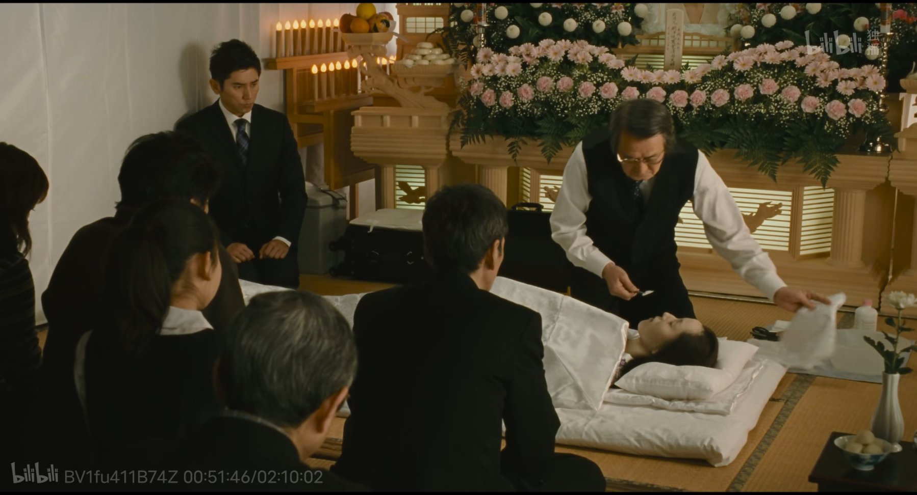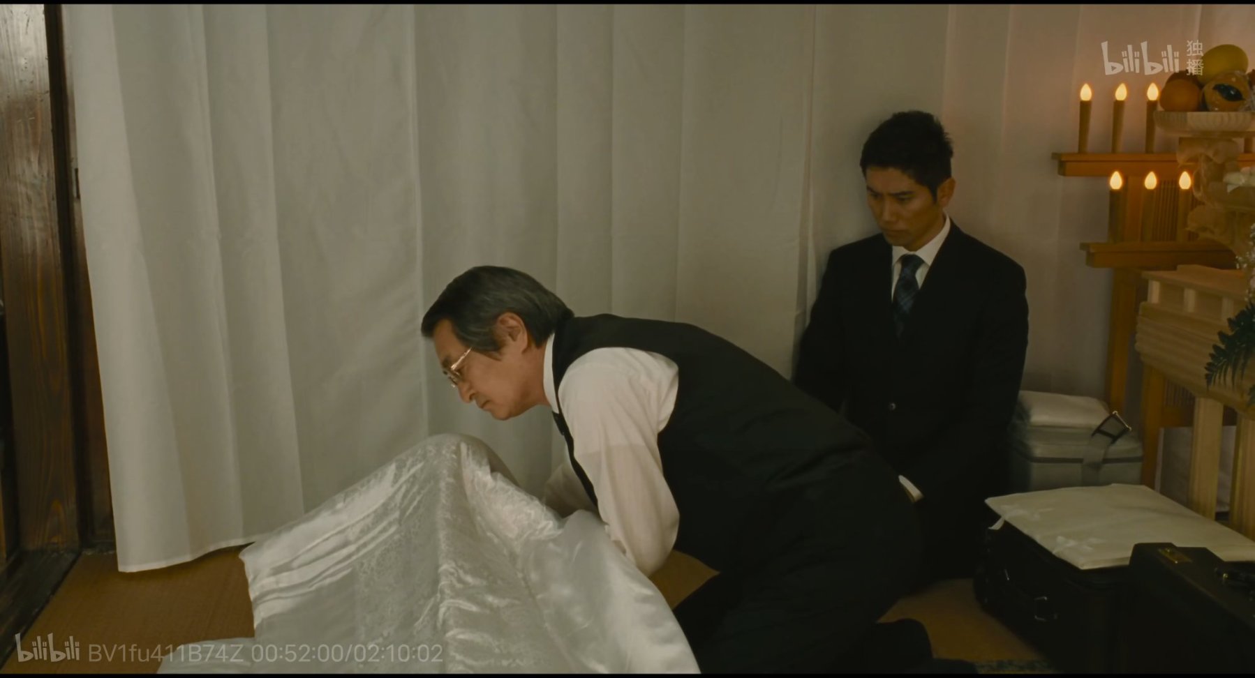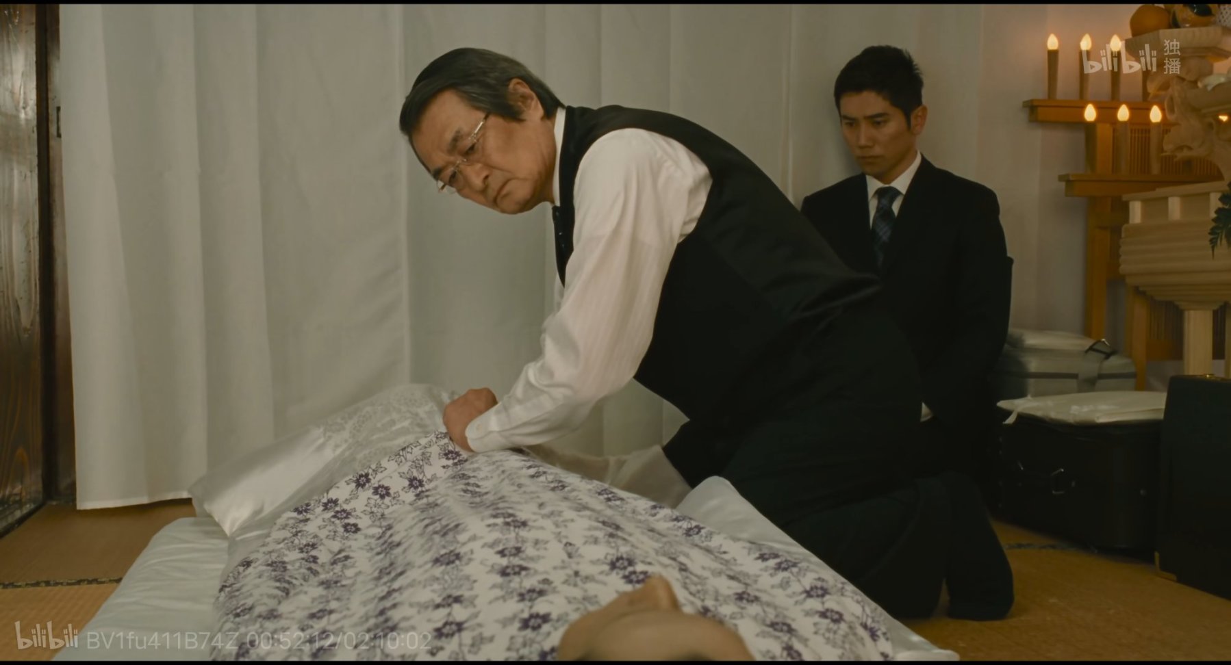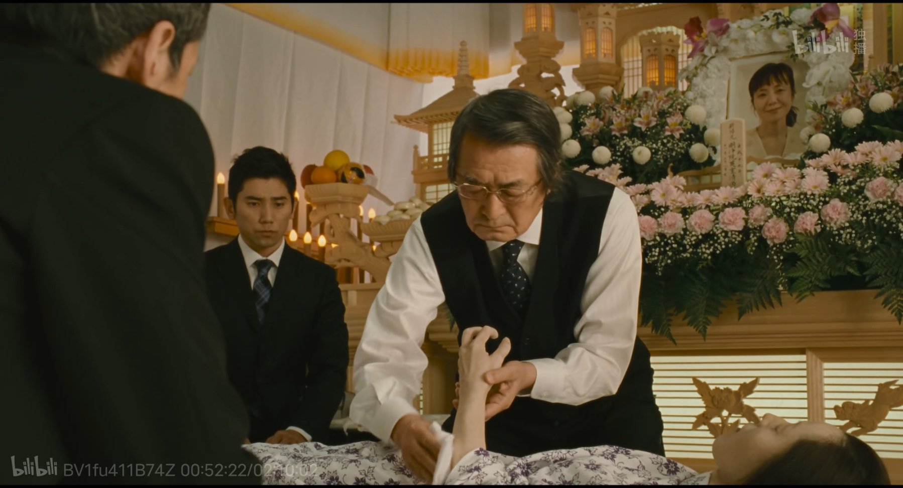 后面的剧情就是给人称述纳棺仪式了,不过小插曲就是迟到了,这部剧表达的还不算明显,亲人的离别会使人狂躁。社长给小林展示了什么叫端庄正常的纳棺仪式。