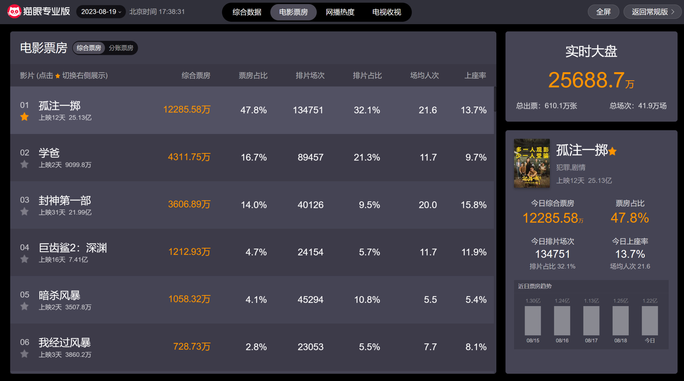根據第三方數據平臺貓眼專業版的數據顯示:由張藝興、金晨、王傳君等主演的犯罪類電影《孤注一擲》在上映12天后,中國內地票房突破25億元!
