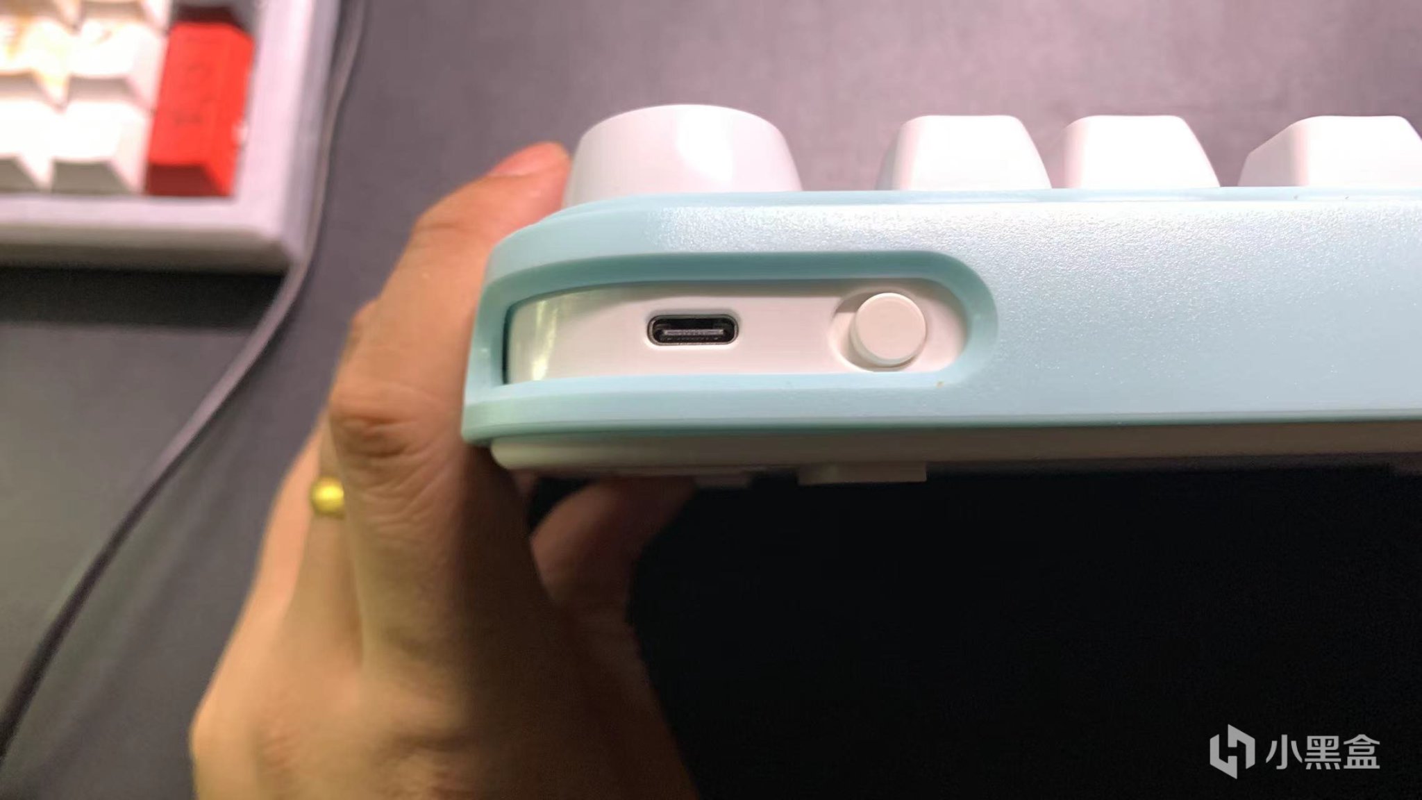 键盘的右上角就是这把键盘的充电口以及无线模式的开关,但是这里的上盖因为这个开口设计的原因,与键盘整体的卡扣有一些空隙,这个算得上是一个小缺点。