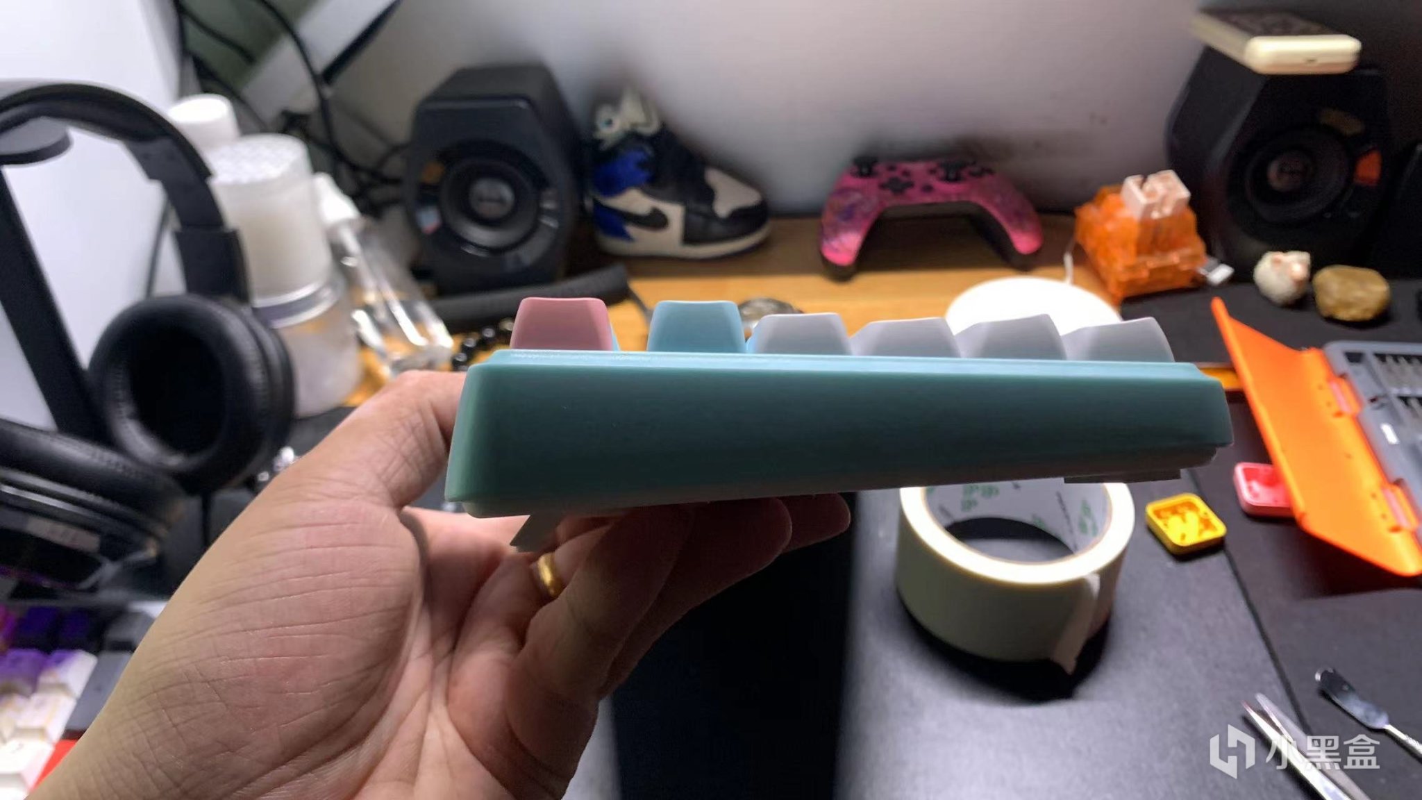 键帽水口处理的不错,空格平整度方面,也没有出现跷跷板的现象,键帽高度属于一个mda高度的,属于xda高度的一种延伸高度,键帽有一定的弧度,有效的防止了误触。